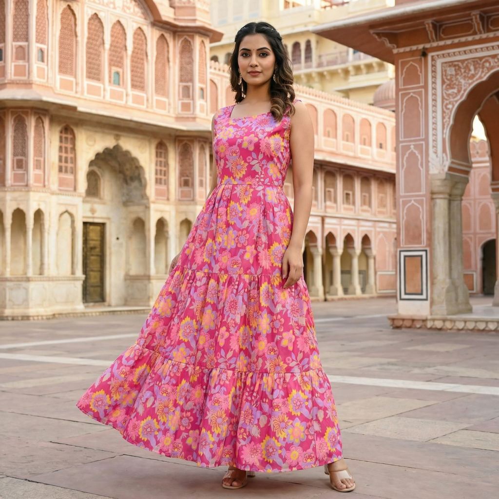Fabric Description : Top :- Cotton Sleeveless Printed Ruffle Maxi Dress | Length :- 52"