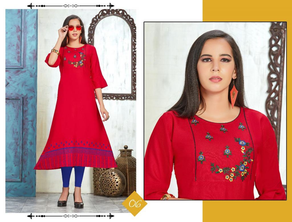 Ft presents Saani Designer Kurti Collection, this catalog fabric is 14 Kg Rayon and designs with different and colors, and this catalog eight designs and work with nack part and this catalog is top very fine fabric and designs are very fine look with inside some Embroidery work and pattern all are very fine.