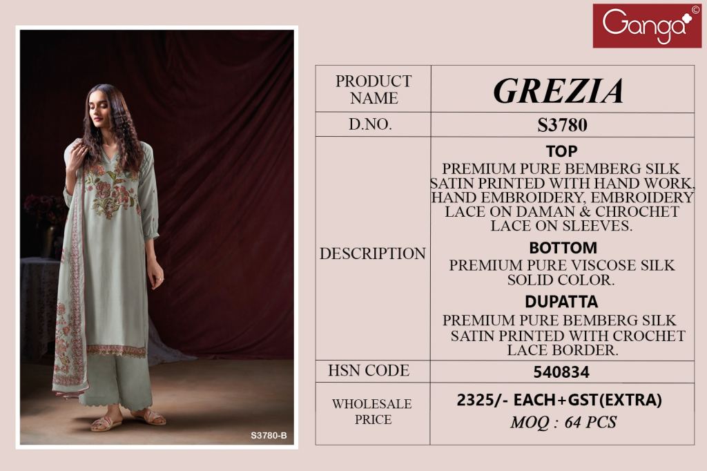 Ganga Grezia 3780 Bemberg Silk Printed Salwar Kameez Suits Full Catalog