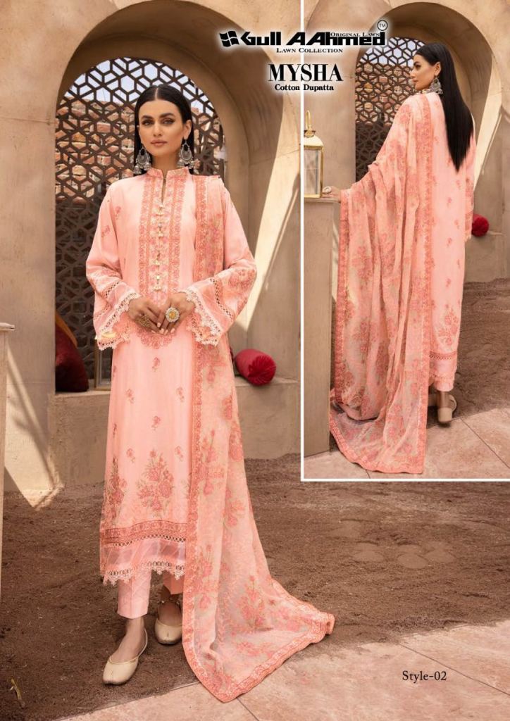 Gull Aahmed Mysha vol 1 Lawn Cotton Karachi Dress Material Collection, this catlog fabric is Pure Lawn Cotton With Neck Embroidery (2.40 Mtr) and the Bottom fabric is Pure Lawn Cotton (2.0 Mtr) with Dupatta are Pure Mal Mal Cotton (2.25 Mtr),