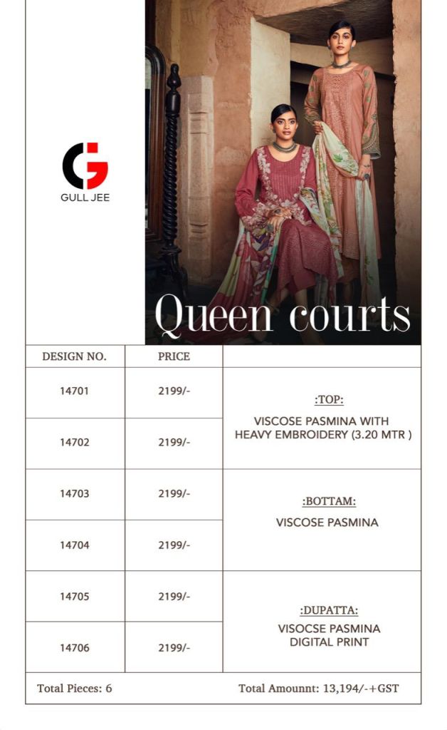 Gull Jee Queen Courts Pashmina wholesale Dress Material collection, this catlog fabric is Viscose Pashmina With Embroidery (3.20mtrs) with Bottom fabric is Viscose Pashmina and Dupatta fabric is Viscose Pashmina Digital Print also.