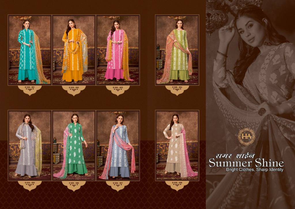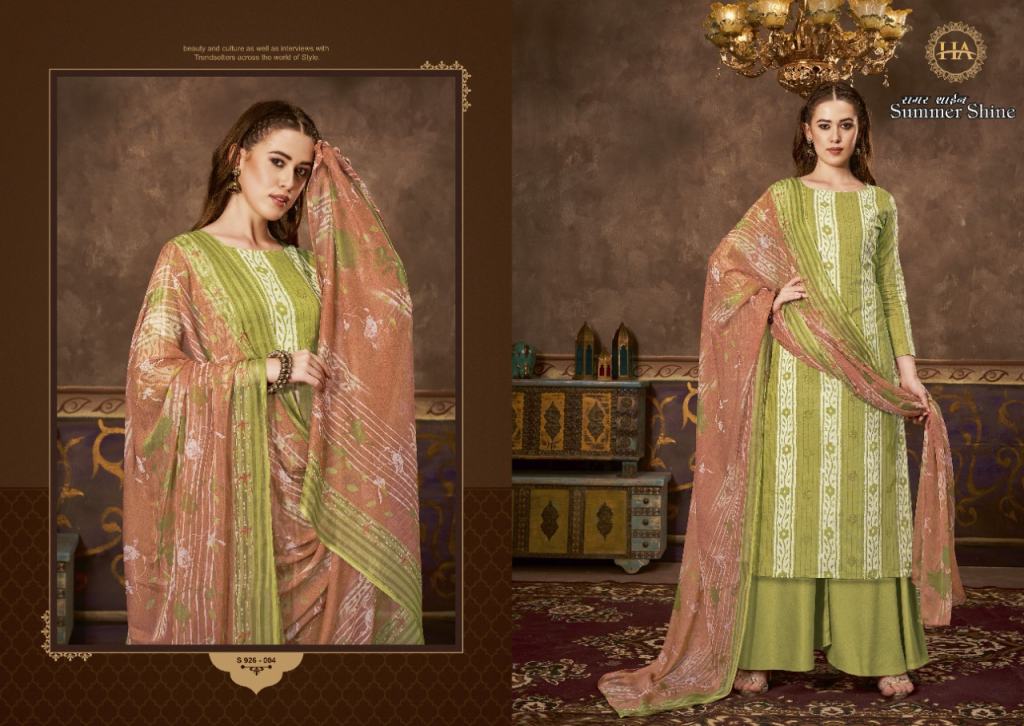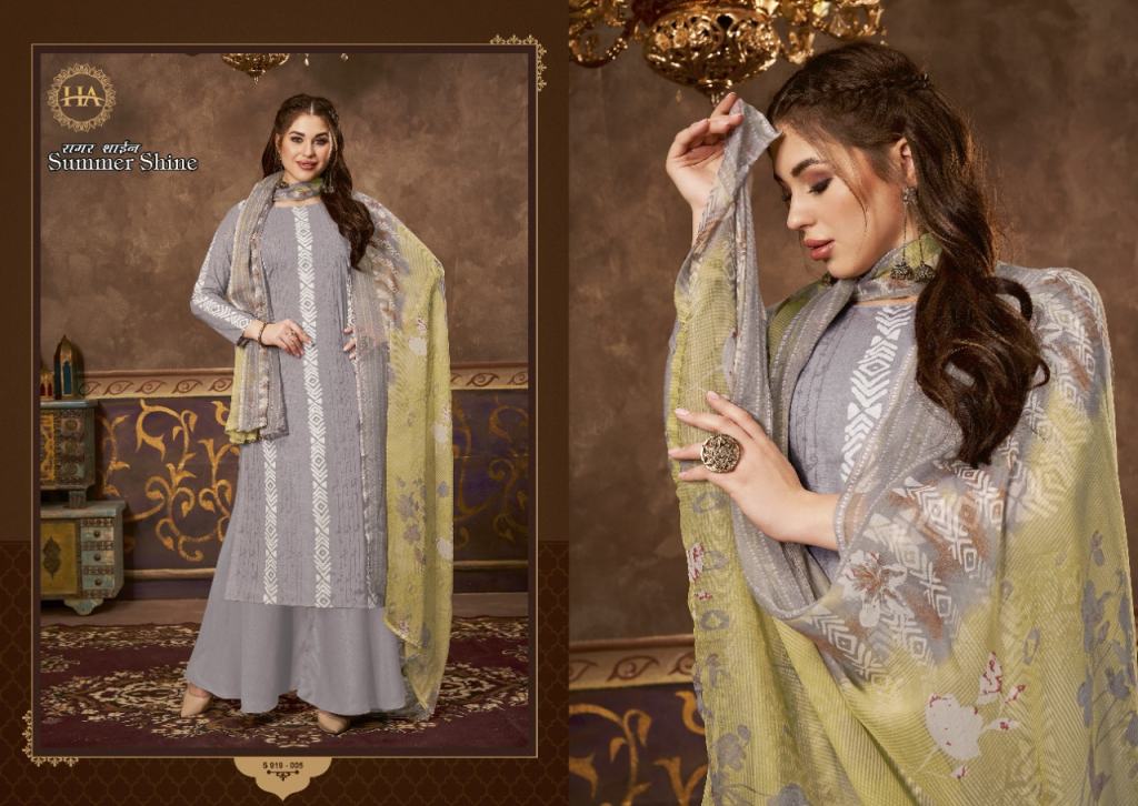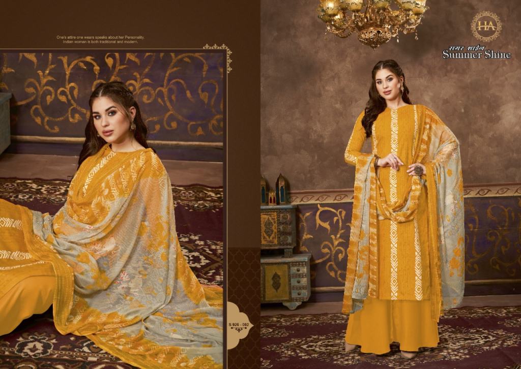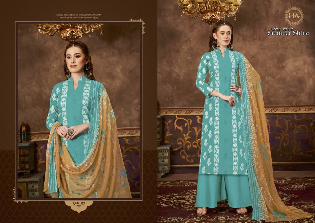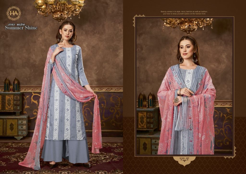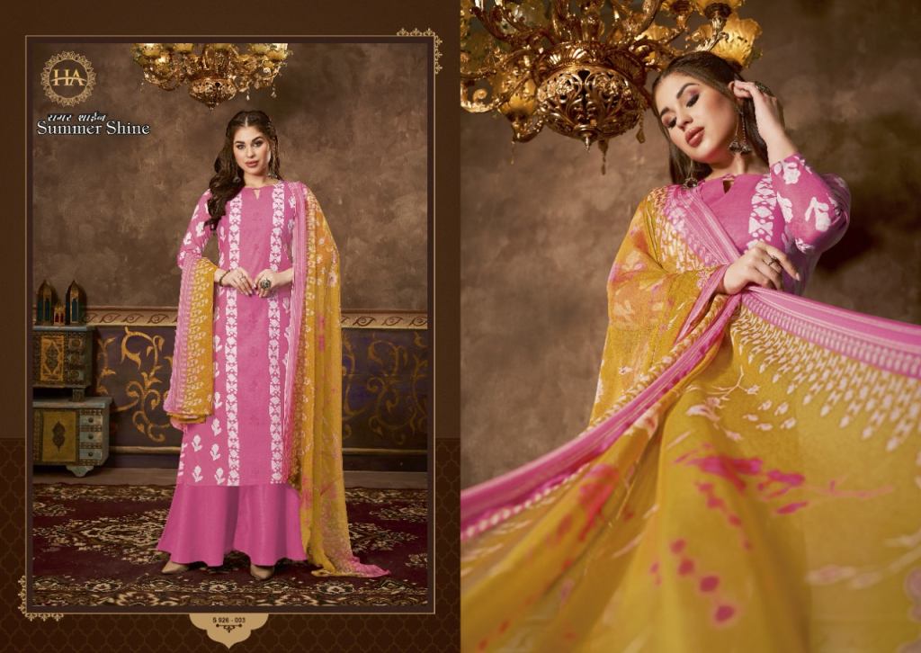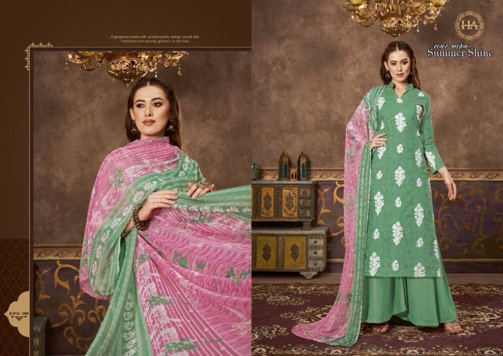Harshit Summer Shine Catalog Pure Cotton Party Wear Women Dress Materials .This catalog top fabric is pure cotton designer printed, the bottom fabric is pure cotton solid and the dupatta fabric is pure Nazneen chiffon print.