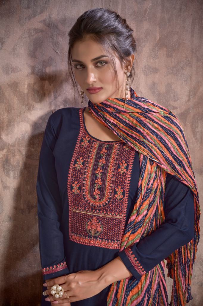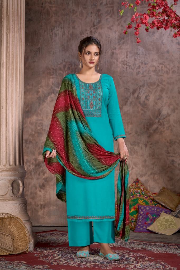 Hermitage Bandhej Festival Wear Designer Dress Material, this catalogue fabric is Pure Viscose Slub Reyon | Swarovski Embroidery on Top fabric is Daman & Sleeves (2.50 Mtrs) Dupatta fabric is Pure Designer Bandhej Crush Dupatta (2.30 Mtrs) with Bottom fabric is Pure Reyon Solid (2.70 Mtrs).