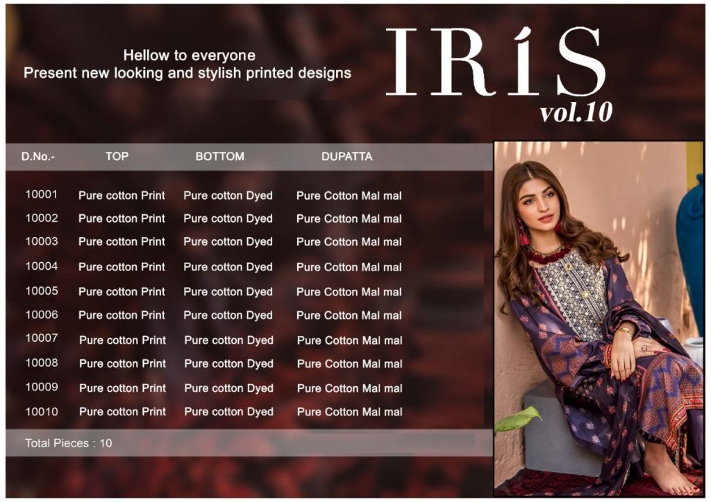 Iris vol 10 Cotton Karachi Dress Materials Collection Buy Online wholesale ladies Dress materials, this catalog top fabric is pure cotton and fancy print with 2.40 mtr and bottom is cotton and 2.00 mtr and dupatta is 2.25 mtr with different print and different colors.