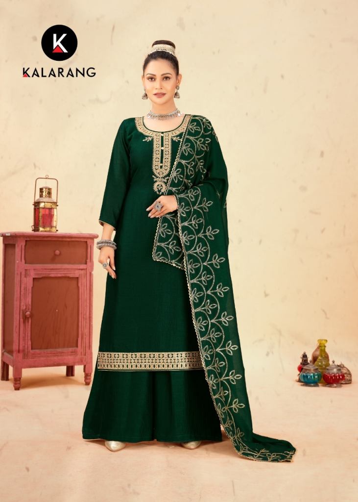 Kalarang Shreya Heavy Designer Salwar Suit Collection, this catalogue Pure Vichitra Silk With Work and Bottom fabric is Pure Viscos Shantoon with Dupatta fabric is Pure Vichitra Silk With Work.