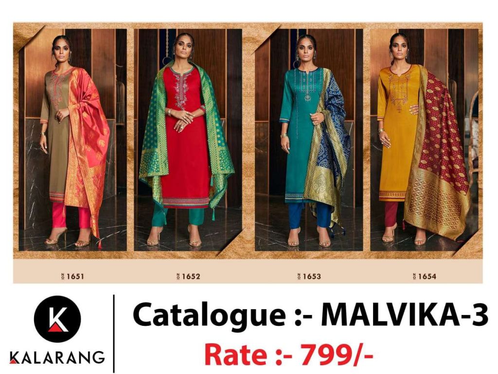 Kalarang presents Malvika vol 3 Designer Dress Material,this catalog fabric are jam cotton silk with embroidery work and designs with color combination are different.