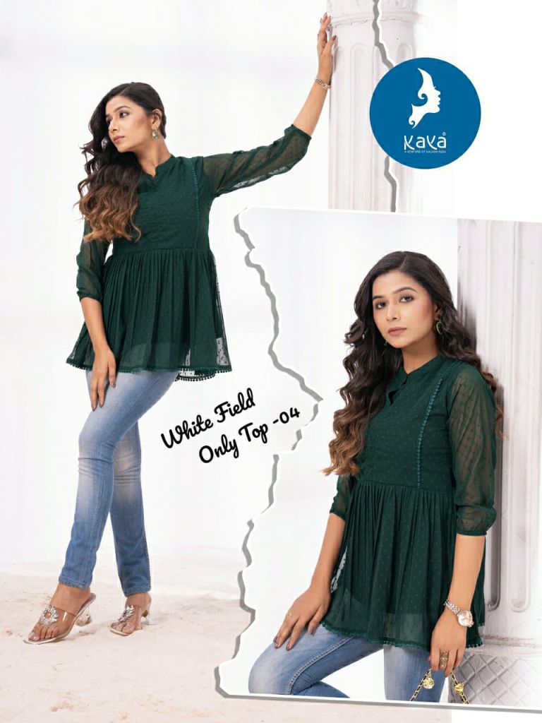Kaya White Field Georgette Butti Casual Wear Short Top Collection Full Catalog