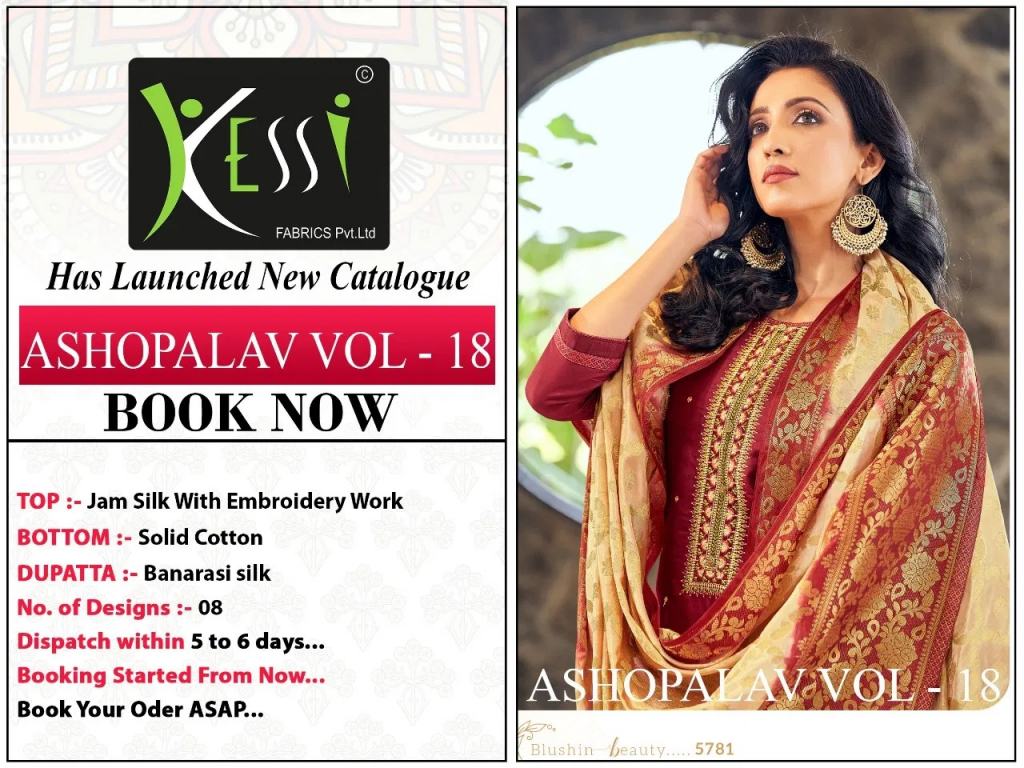 Kessi presents Asopalav vol 18 Designer Dress Material, this catalog top fabric is Jam Silk with Embroidery Work and this catalog bottom fabric is Solid Cotton the catalog dupatta fabric is Banarasi Silk. and this catalog a beautiful collection.