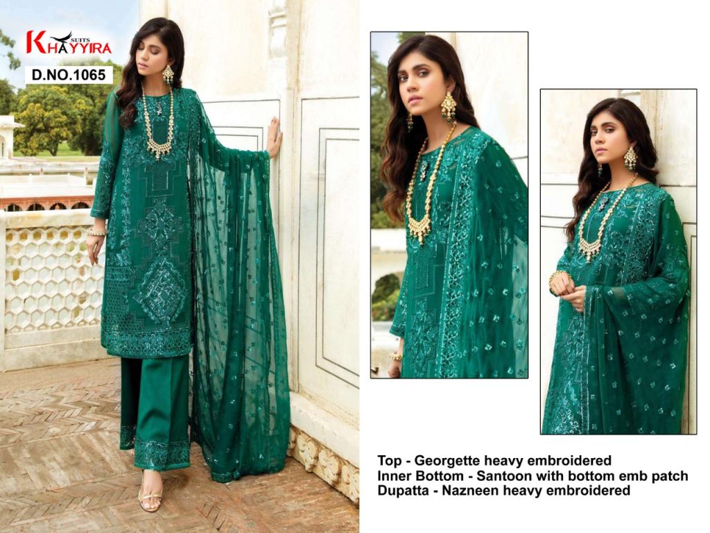 Khayyira presents Eleonra Collection Designer Pakistani Suits Collection, this catalog top fabric is Heavy Embroidered Georgette semi stitch and bottom is Santoon Silk with bottom patch inner and dupatta is Nazneen/Net heavy embroidered and this catalog total five designs with color combinations and designs are unique.
