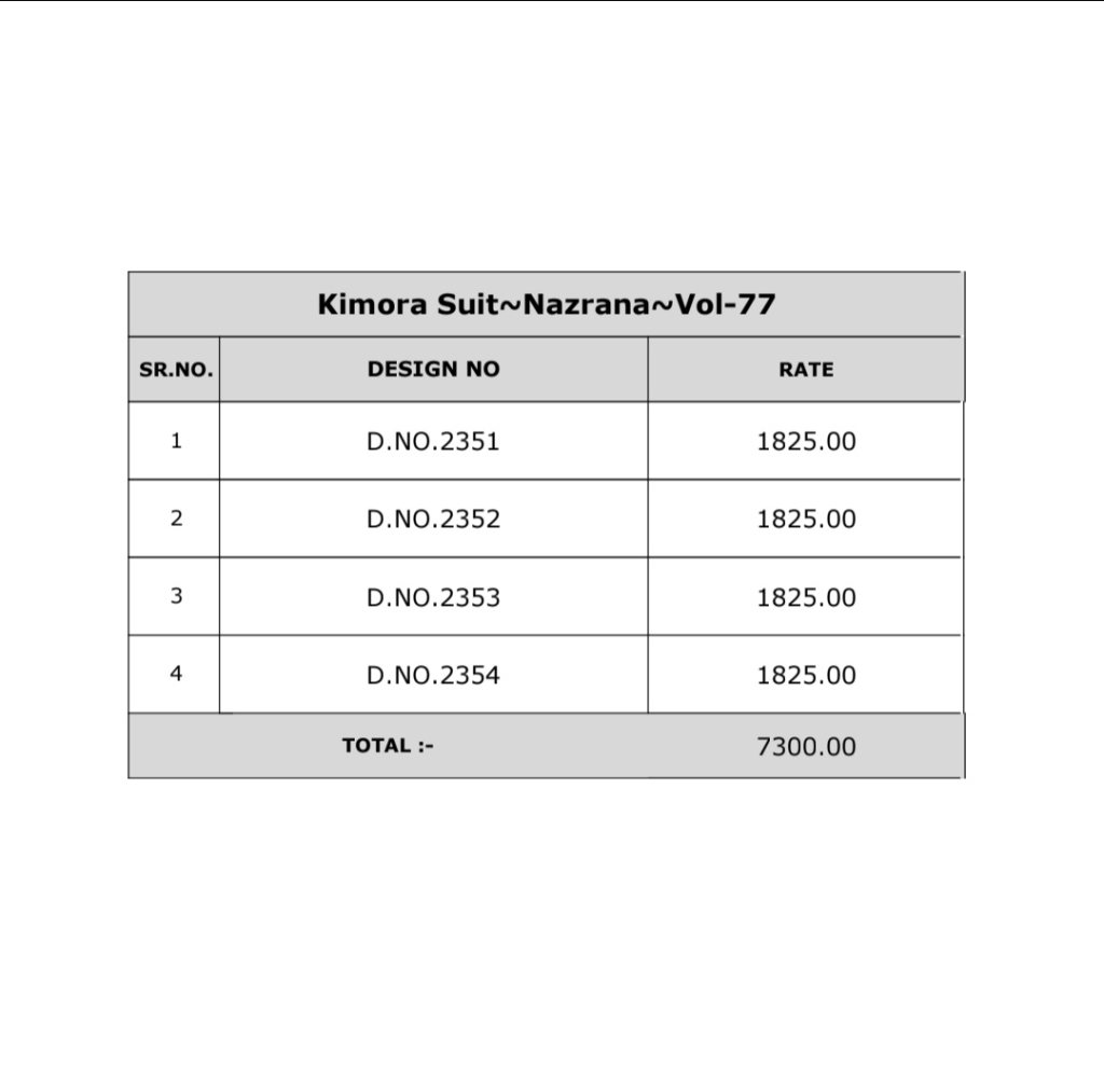 | NAME : | Kimora Nazrana Vol 77 Digital Printed Salwar Kameez |