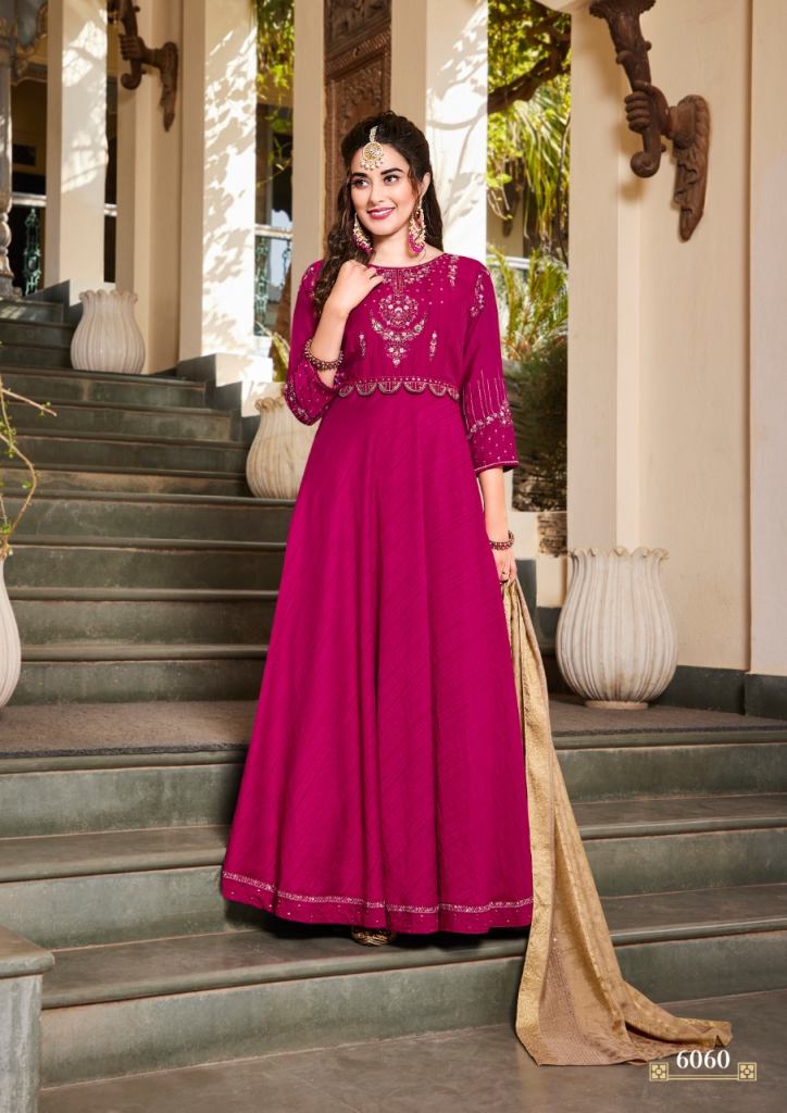 Koodee Sundra Vol 1 catalog Festival ware Viscose Designer Anarkali Kurti With Dupatta, this catalog top fabric is Fancy Viscose (Half inner) with dupatta fabric is Pure Viscose Jacquard Dobby Work: Embroidery + Khatli Work.