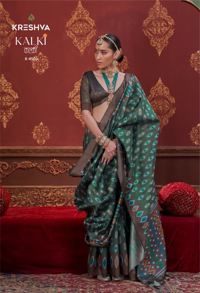Kreshva Kalki Silk Ikkat Design With Hand Marmo Finish Saree Collection Full Catalog