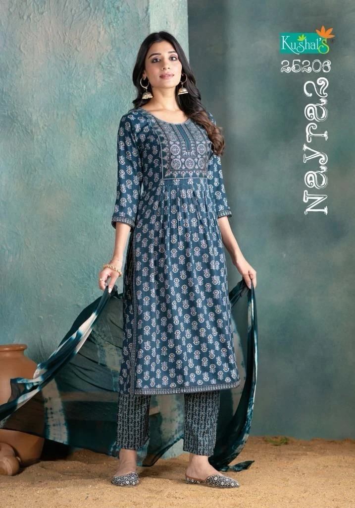 | NAME : | Kushals Nayra 2 Rayon Capsule Print Naira Cut Kurti Set |