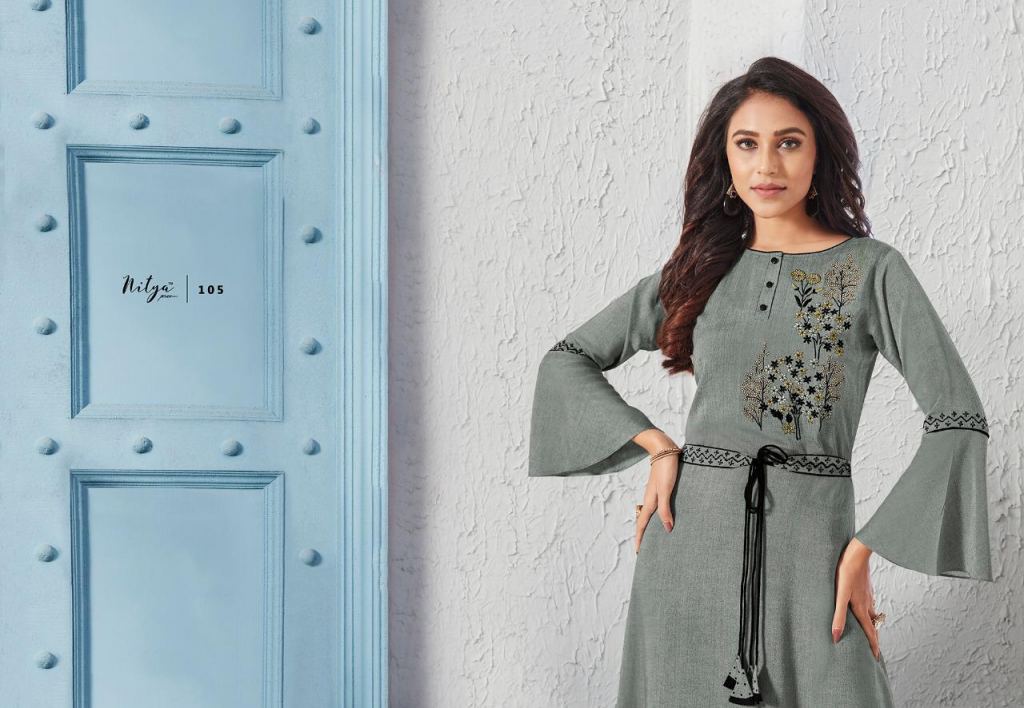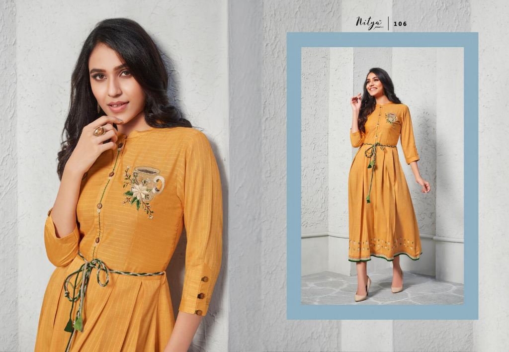 Nitya catalogue is set of different designer long kurtis with different designs and colours.