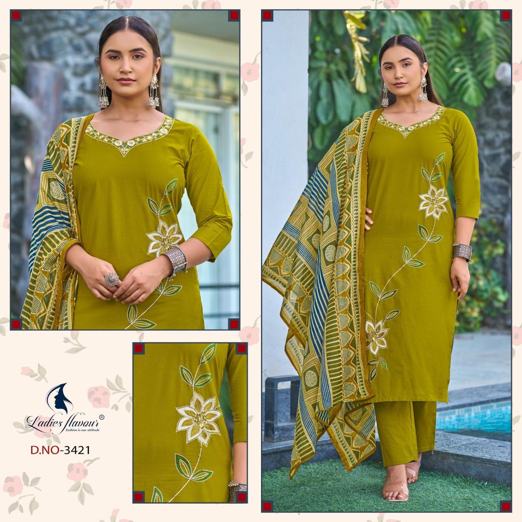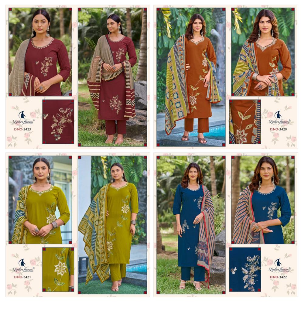 Ladies Flavour 3420 To 3423 Cotton Embroidered Kurti With Bottom Dupatta Full Catalog