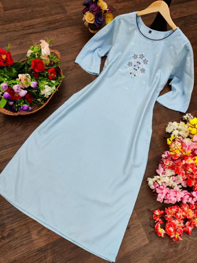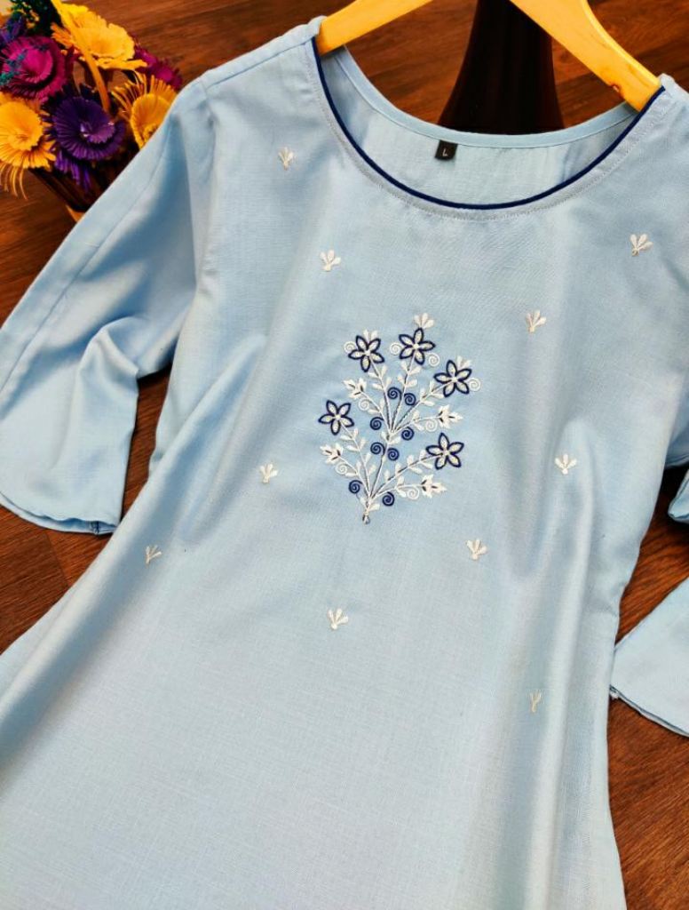 Low Price Embroidery work SSL 604 Designer Kurtis Collection, this catalog fabric is ruby cotton and this catalog total one design with one color with three size and catalog color a sky with neck part little paten and catalog are set to set Kurti collection in shopping.