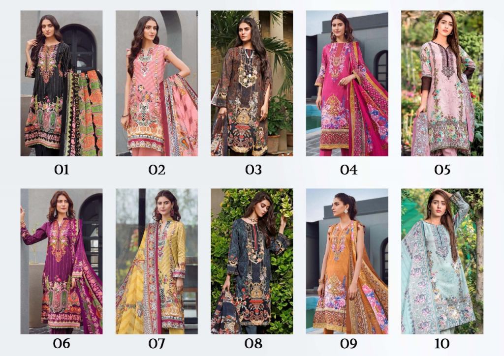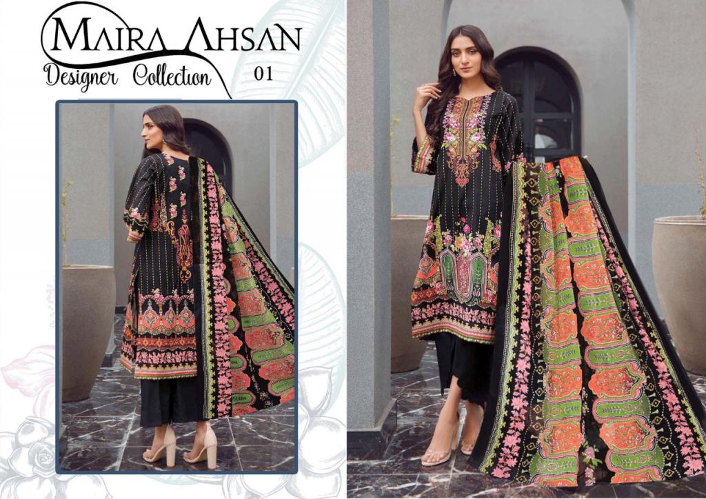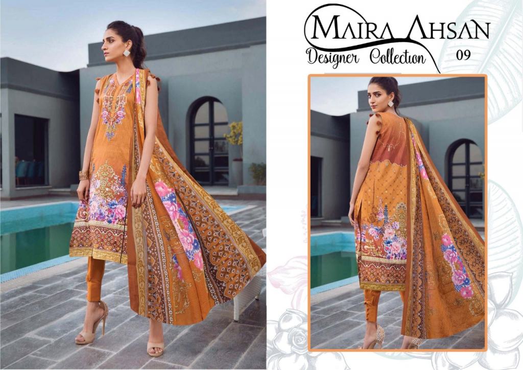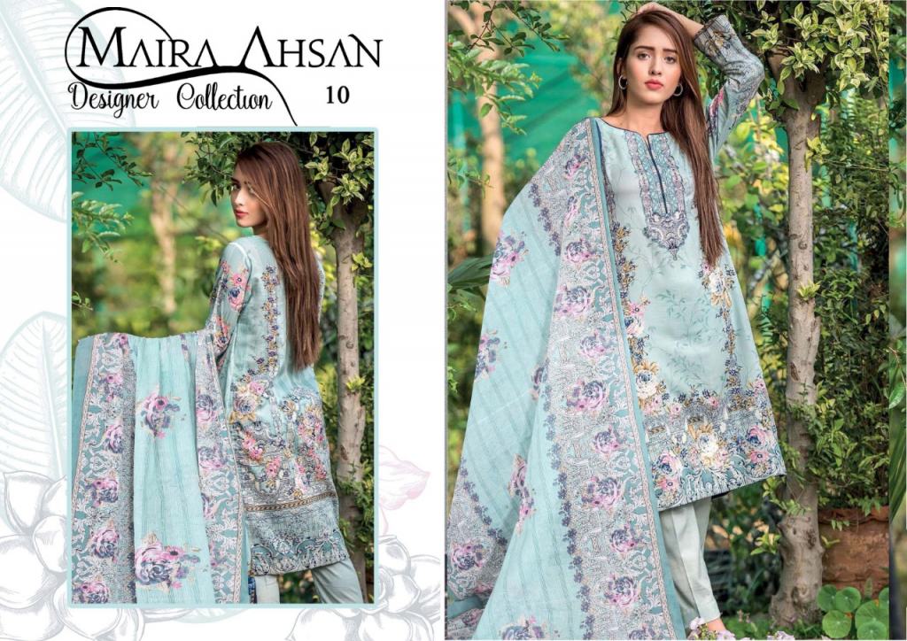 Maira Ahsan Designer collection vol 1 Salwar Suit Wholesale Catalog 10 Pcs, this catlog top is 2.40 mtr and bottom is 2.00 mtr and dupatta is 2.25mtr and tis catalog design are different with cotton printed collection and book with bag also.