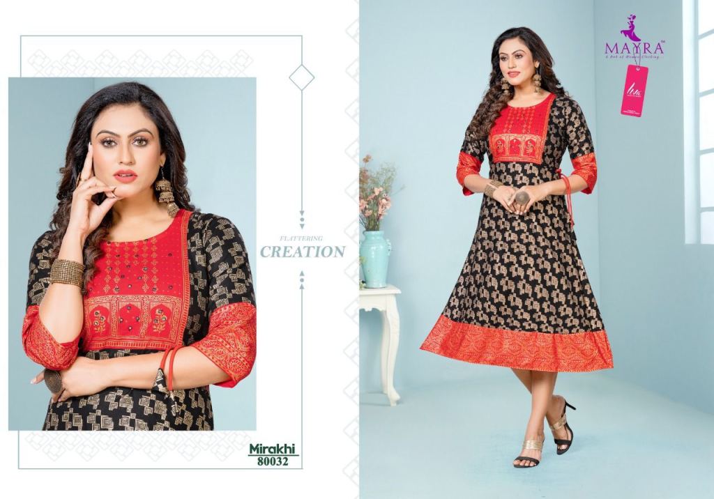 Mayra Mirakhi Ethnic Wear Anarkali Kurtis Collection, this catalogue fabric is Rayon Plain 14 Kg with different colours and different designs Our new collection of ethnic wear includes Kurti.