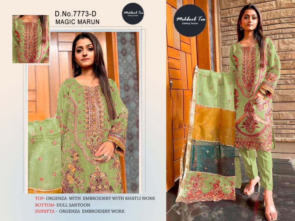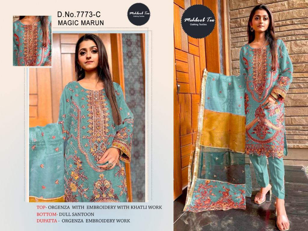 Mehboob Tex Magic Marun 7773 Pakistani Salwar Kameez Collection, this catalogue fabric is Organza with Dupatta fabric is Organza and Bottom and soft inner Santoon (Pakistani Copy).