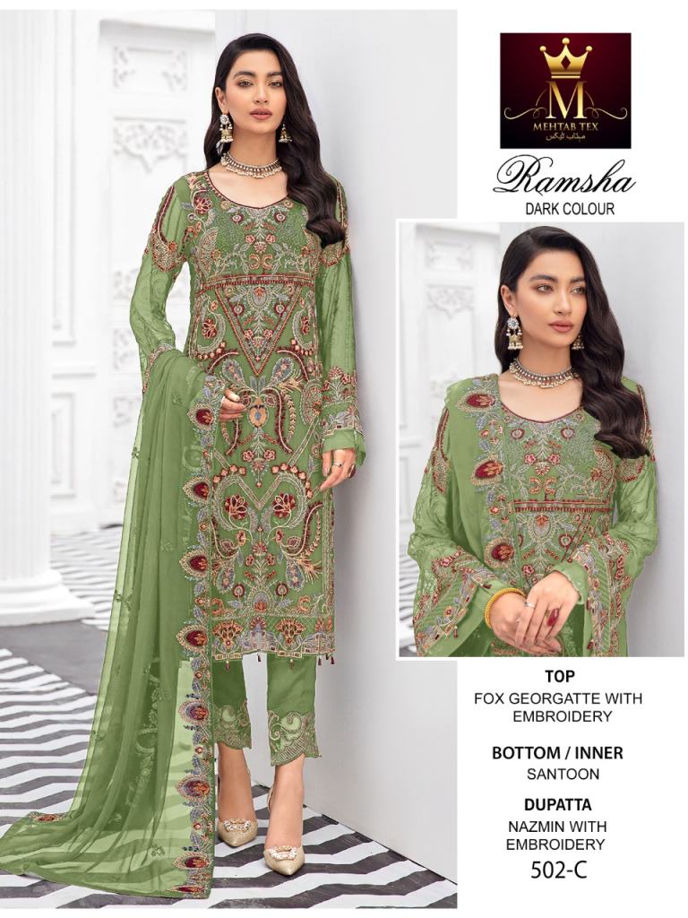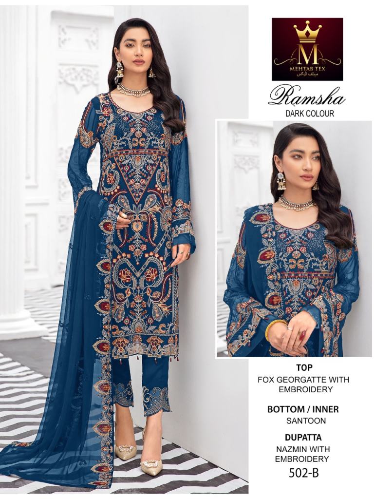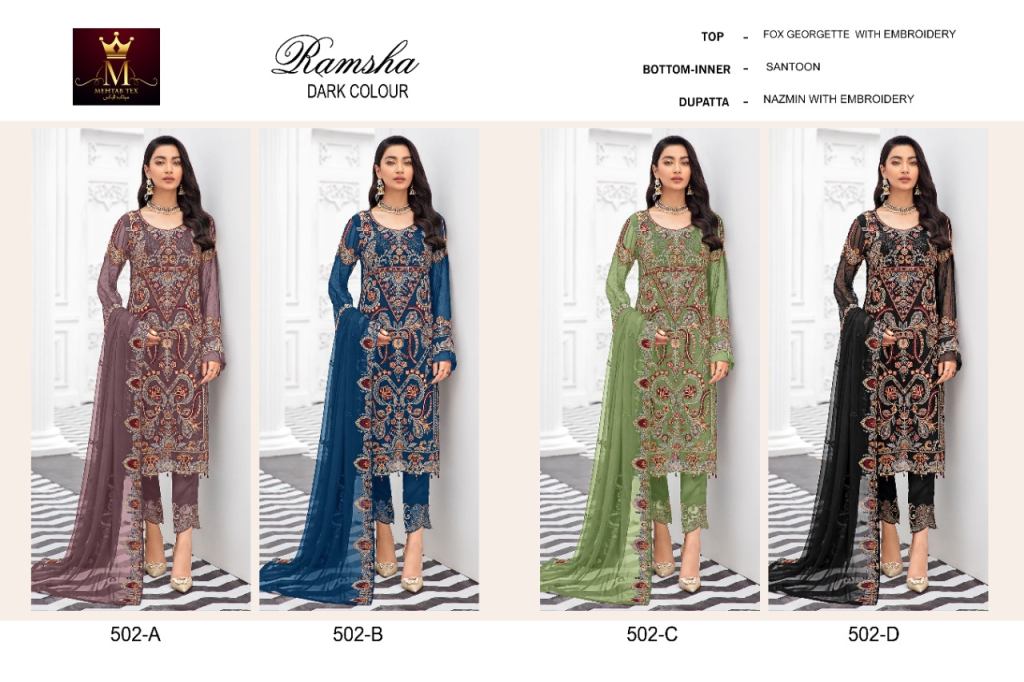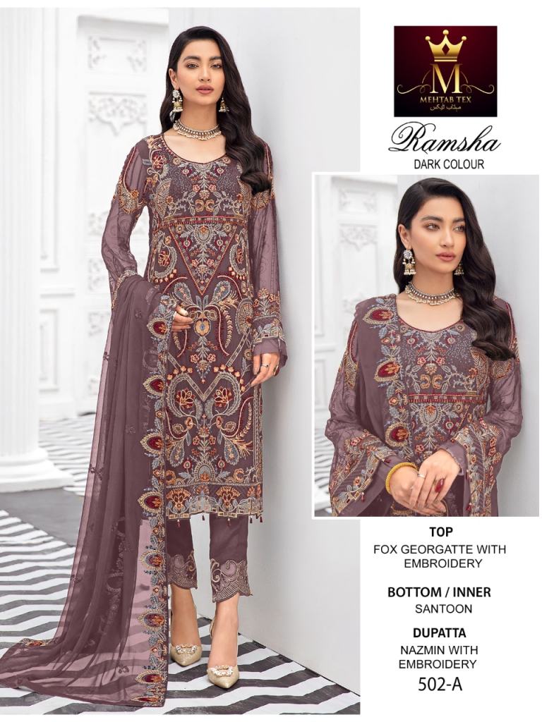 Mehtab Tex Ramsha Dark Colour Pakistani Salwar suits collection, this catlog fabric is Georgette Heavy Embroidery Bottom fabric is Santoon inner and Dupatta fabric is Nazmin with embriodery work with
