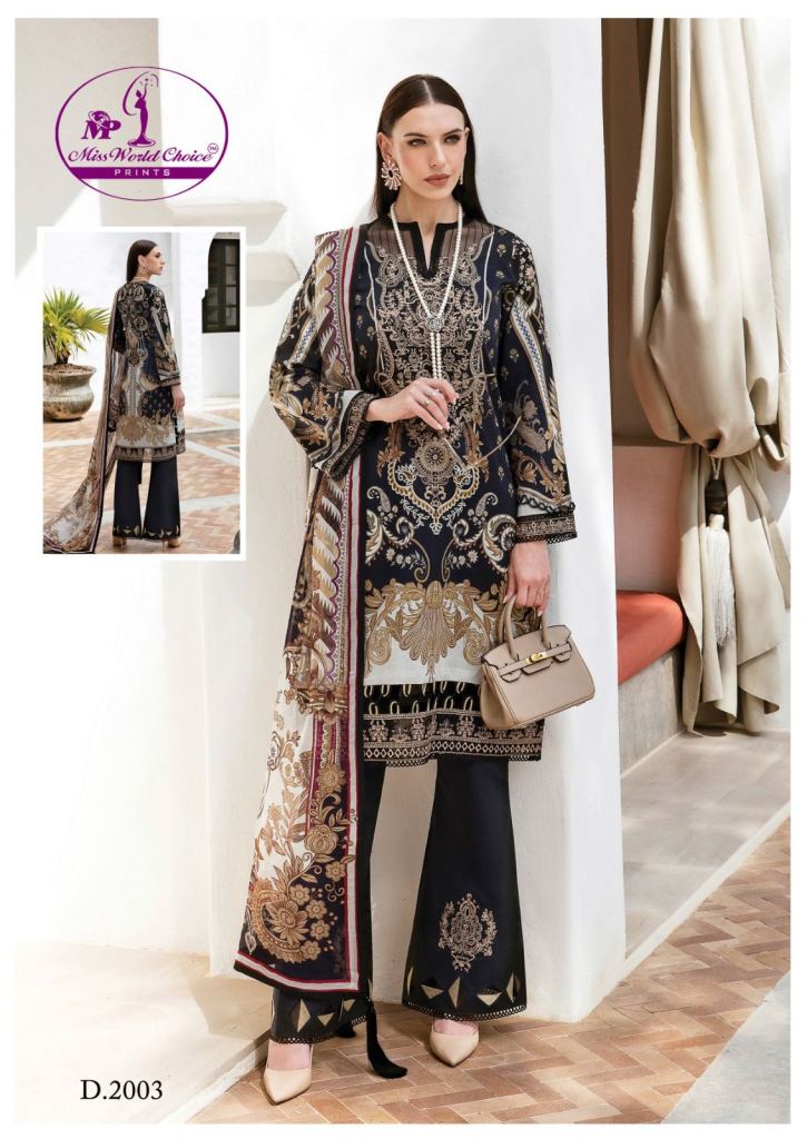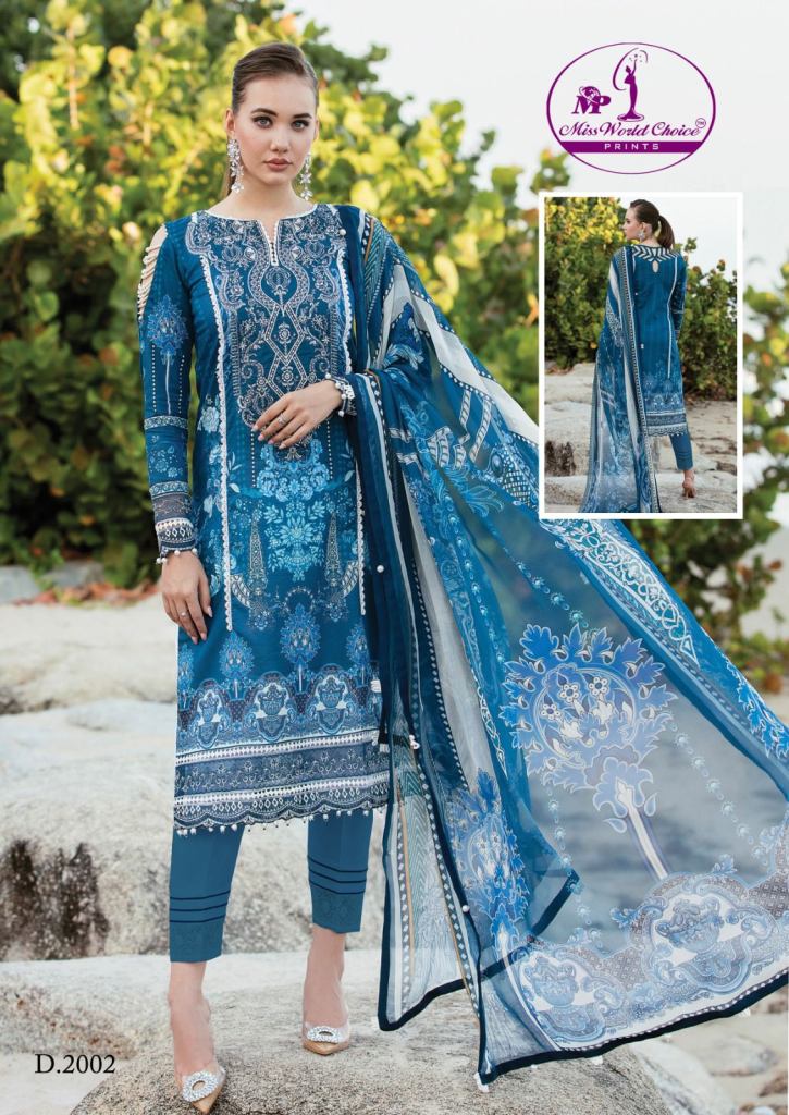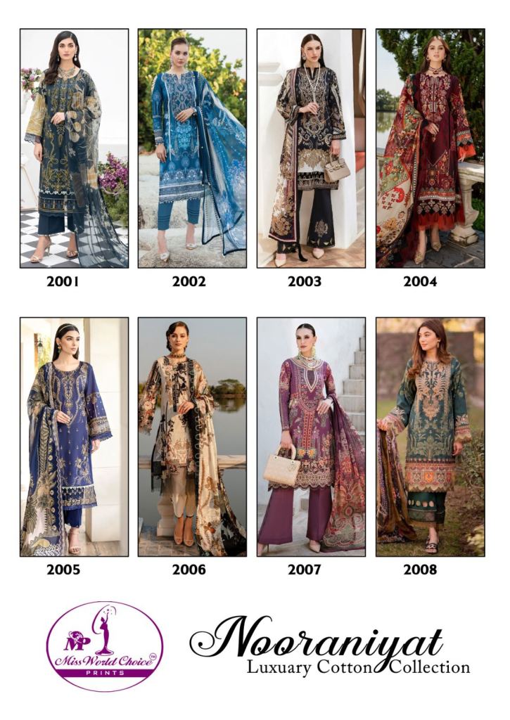 Miss World Nooraniyat Vol 2 Karachi Cotton Dress Material Collection, this catlog fabric is 90 GM Cotton top 2.5 MTR and Bottom fabric is 2 MTR with Dupatta: 2.25 MTR and diffrent fancy print also.