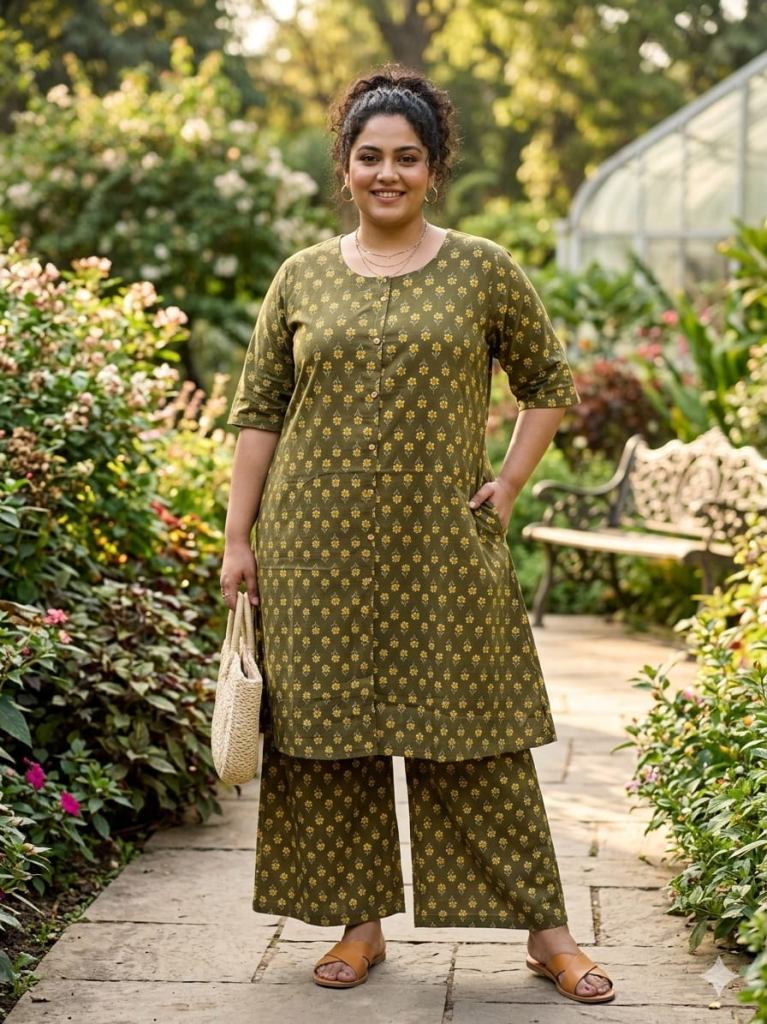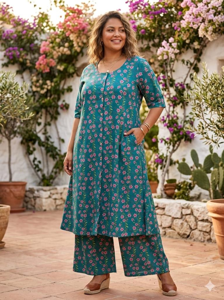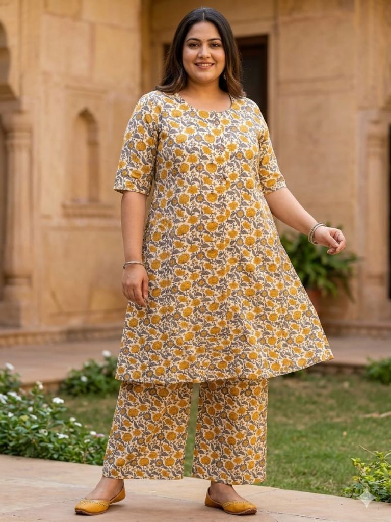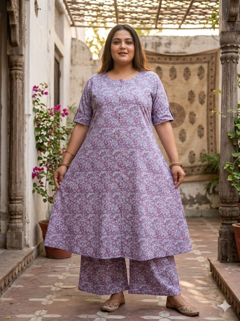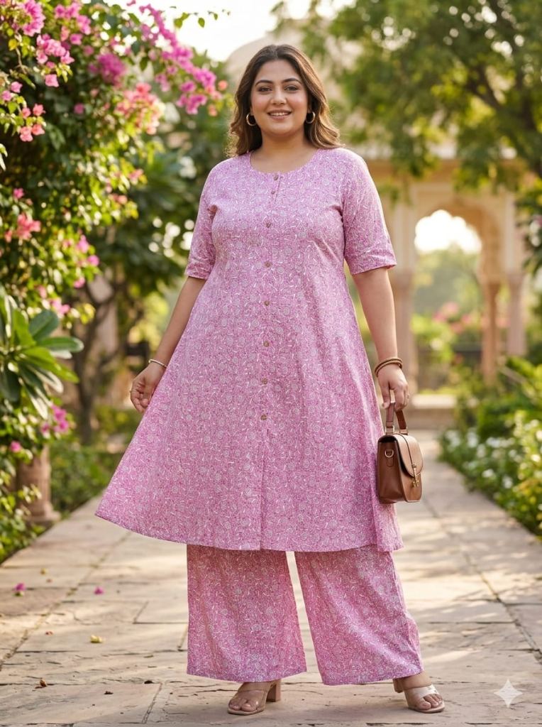 Fabric Description : Top/Bottom :-Cotton Printed Aline Pocket Kurti With Palazzo Set | Top Length :- 44" | Bottom Length :- 37" | Size Set :- ( 46 To 52 ) | But Any Five Color