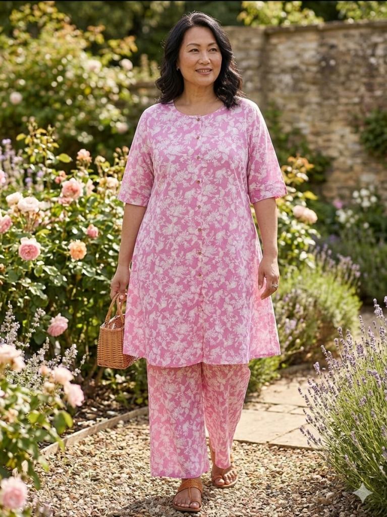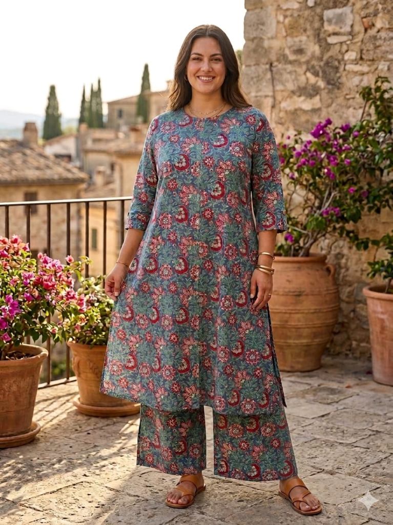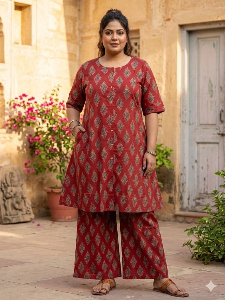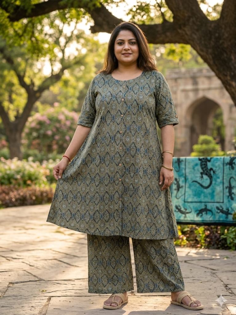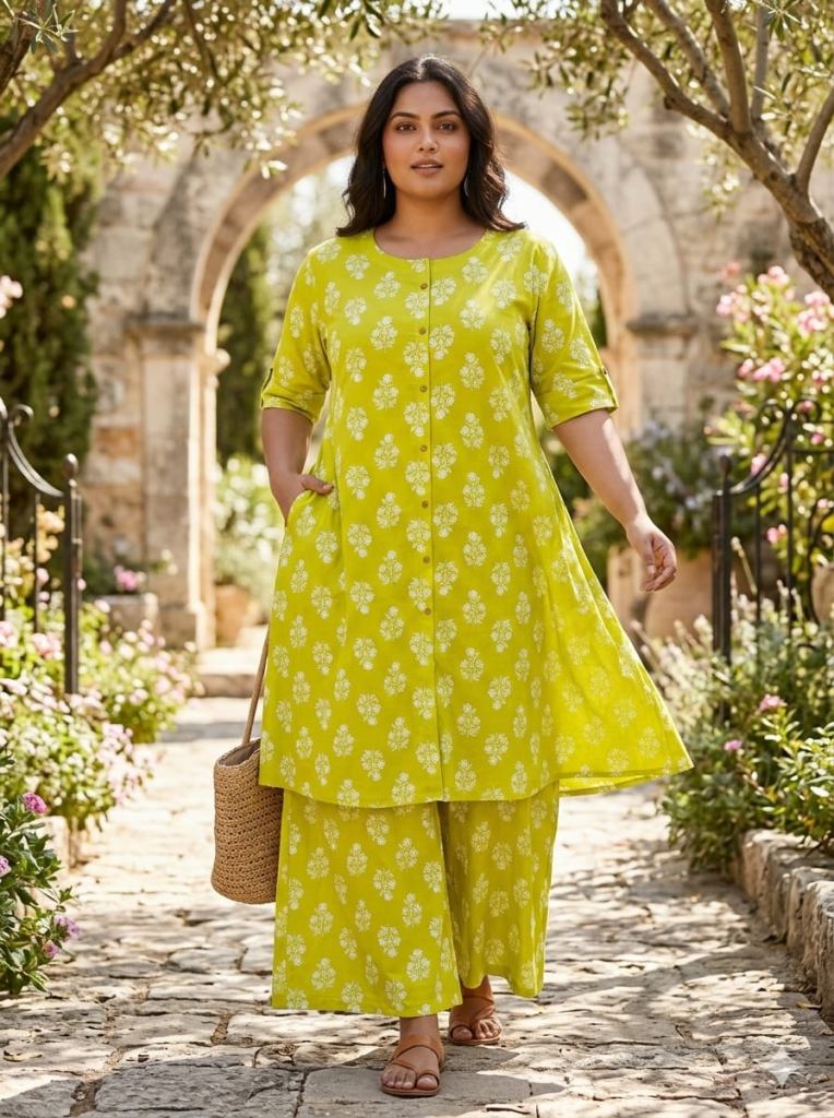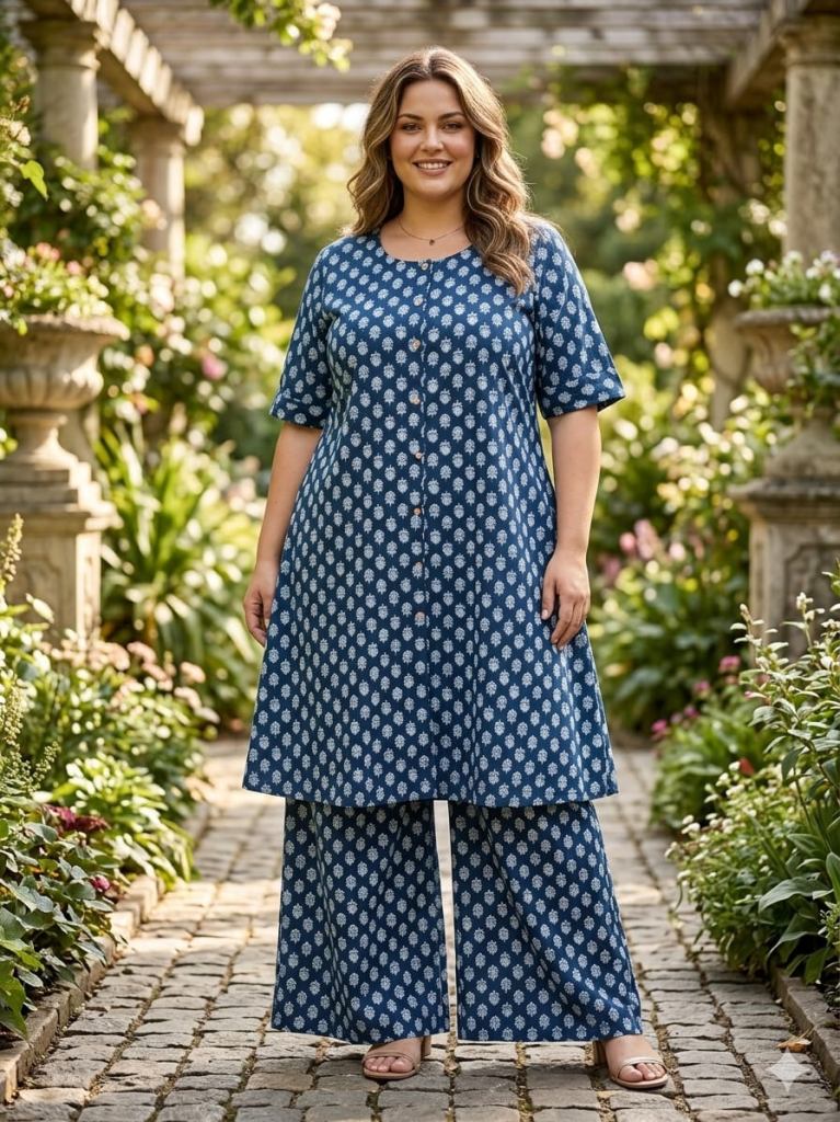 Fabric Description : Top/Bottom :-Cotton Printed Aline Pocket Kurti With Palazzo Set | Top Length :- 44" | Bottom Length :- 37" | Size Set :- ( 46 To 52 ) | But Any Five Color