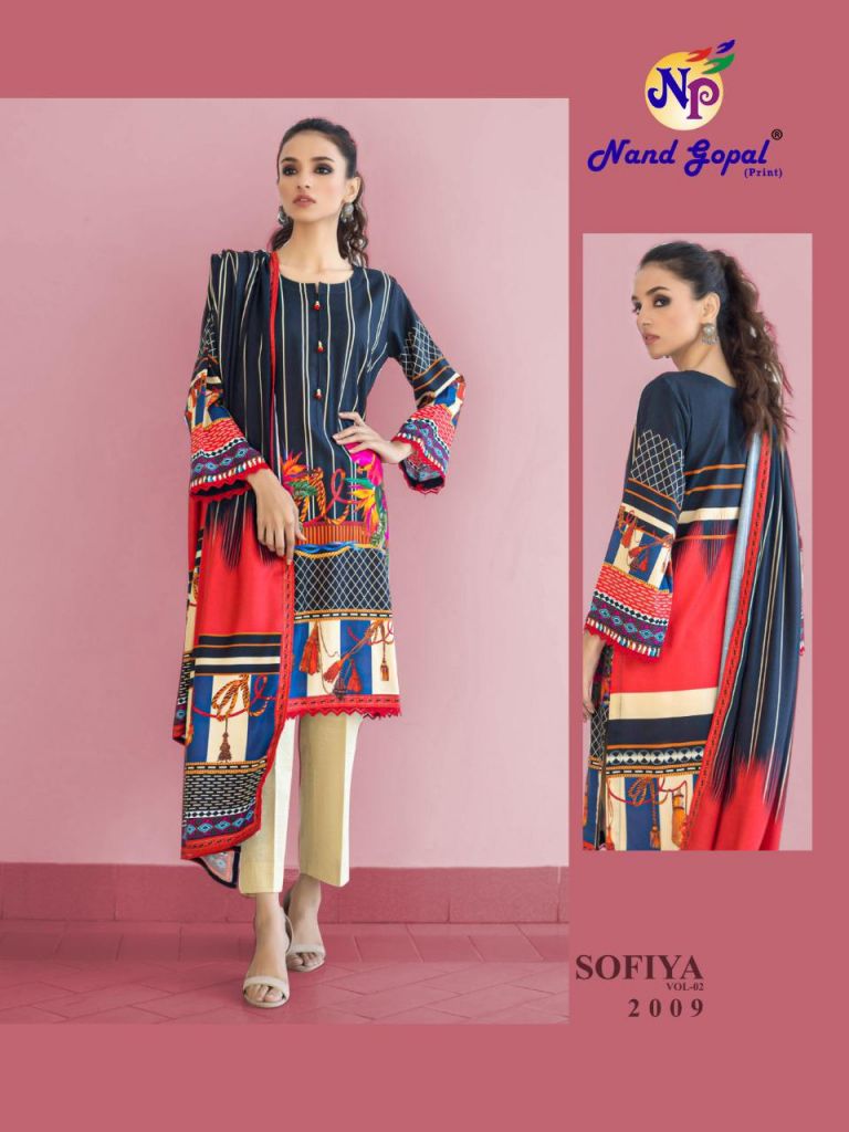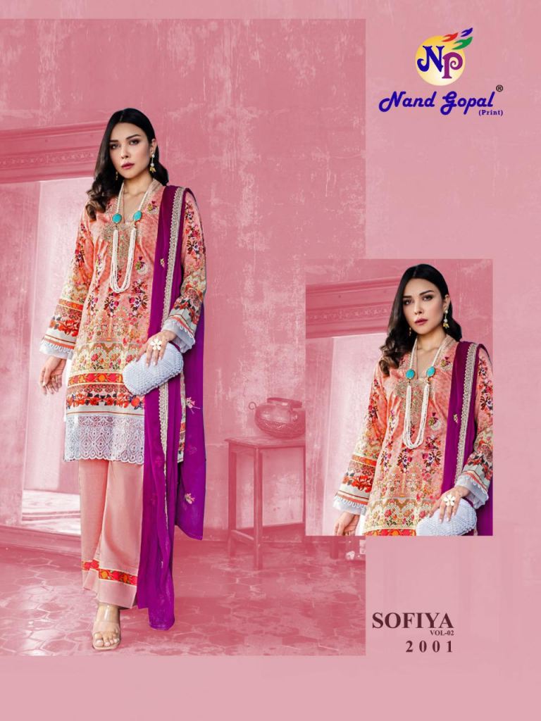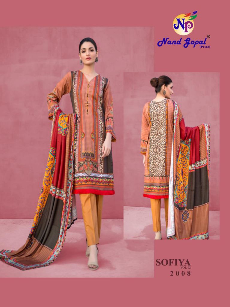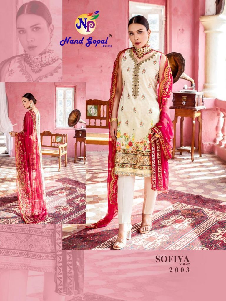 Nand Gopal Sofiya 2 Karachi Cotton Dress Material, this catalog fabric is cotton and Top:-Cotton (2.35 mtr ) | Bottom:- Cotton (2 Mtr & ) | Dupatta:- Cotton Printed (2.25Mtr) and different design are amazing with fancy print also.