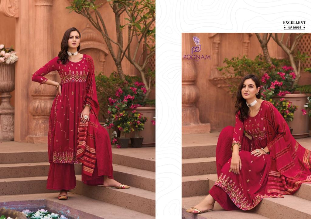 Poonam Utopia Nayra Cut Kurti With Bottom Dupatta Collection,thsi catalogue fabric is Vichitra with Designer Kalakari Embroidery Work & Sequence Work ( Tussle & Dori ) and Bottom are Vichitra Crush Fabric Gharara Palazzo with Inner with Dupatta fabric is Soft Chanderi Jacquard Fabric Sequence Work.