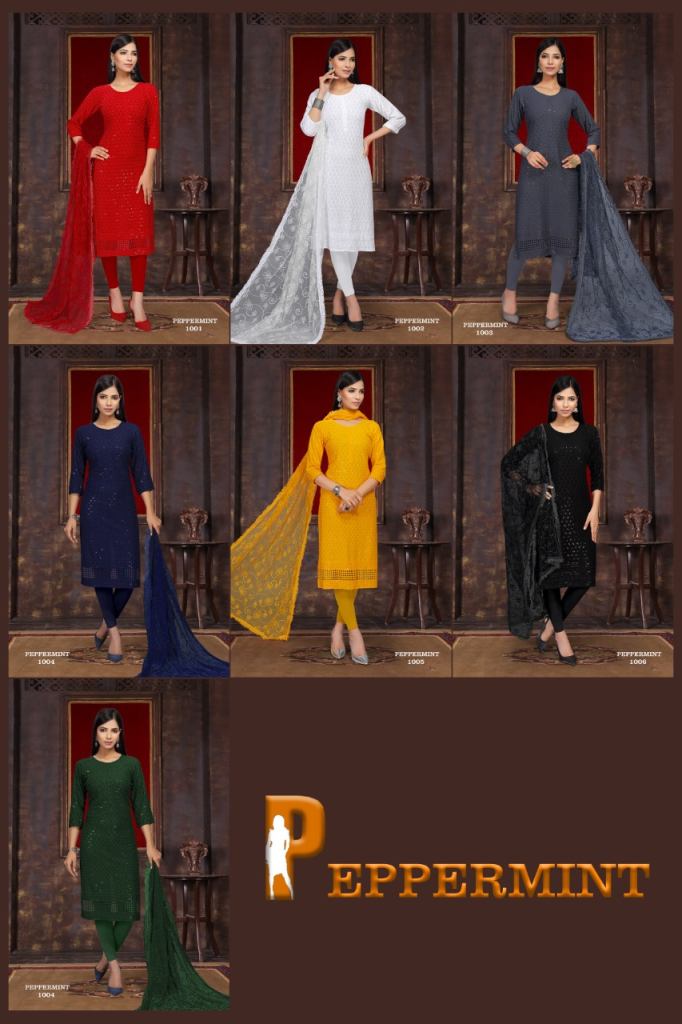 Premnath Peppermint Designer Kurti with Dupatta catalog,thsi catalog fabric is Rayon Chicken Sequence with Net Embroidery dupatta and this catalog design are semi type with colors are different with catalog design are amazing collection.
