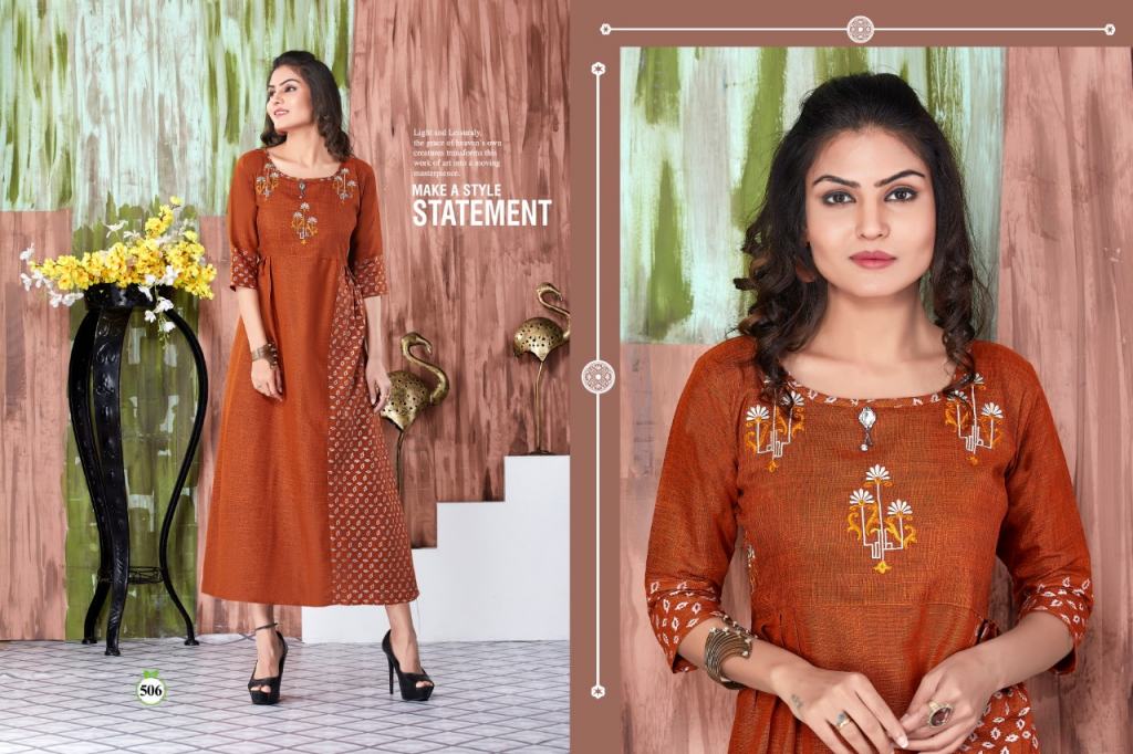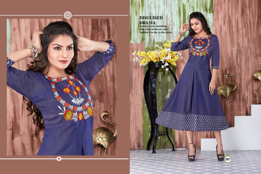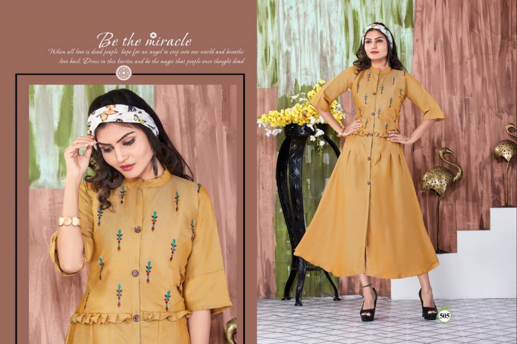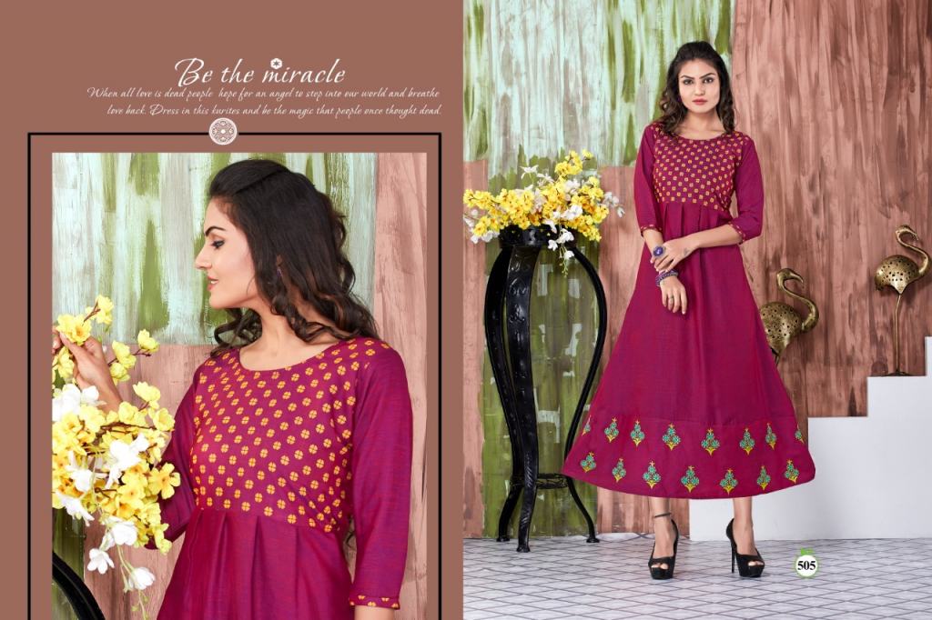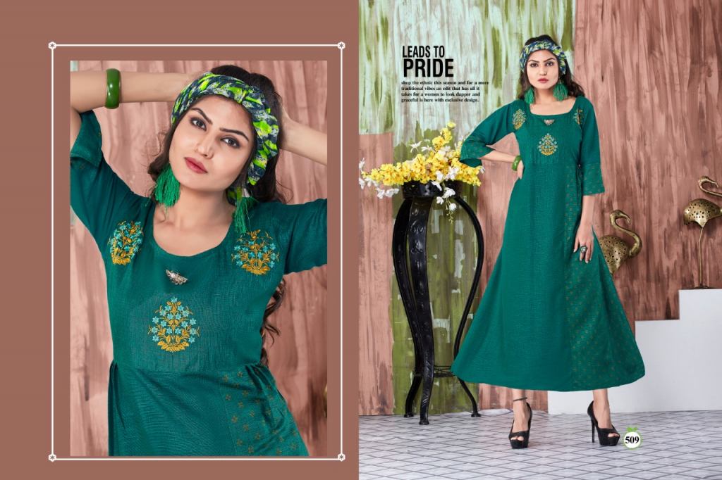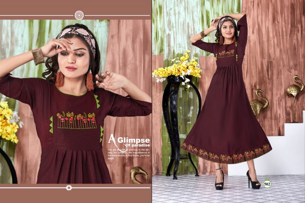 This is the collection of rayon embroidered kurtis with different designs and colours.