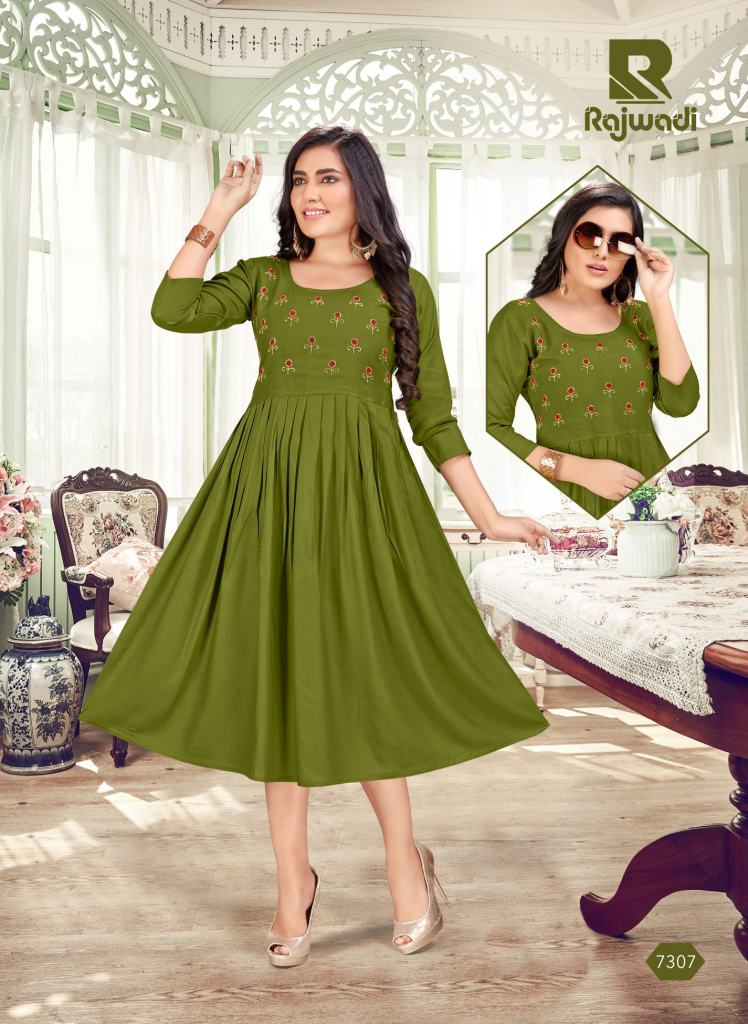 Raashi presents Rajwadi Designer Kurti Collection, this catalogue is Kurtis that are very fine look with some designs in full of the fabric, this catalogue is Anarkali types Kurtis Rayon print & plain with four various types of colour and designs.