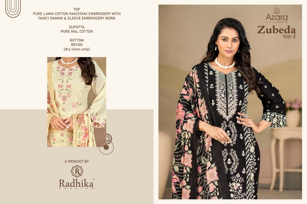 Radhika Azara Zubeda Vol 2 Lawn Cotton With Work Dress Material Full Catalog