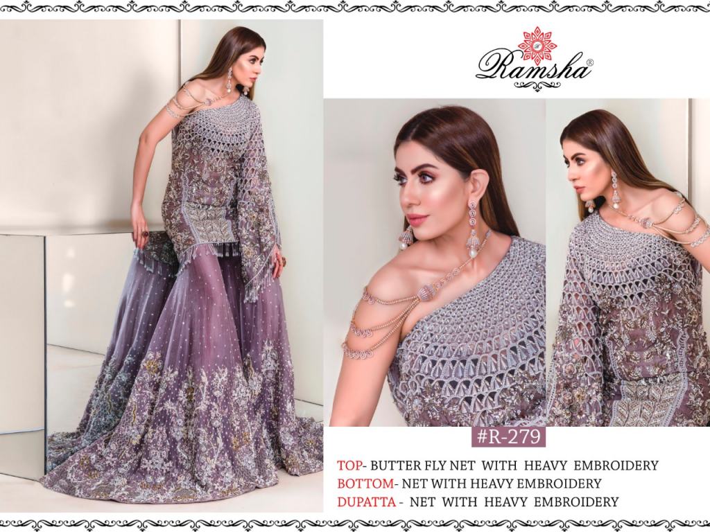 Ramsha Pakistani Salwar Suits Collection, this catalog top is butterfly net with heavy embroidery work and the bottom is net with heavy embroidery work and dupatta is net with heavy embroidery work ( Pakistani copy) and design are amazing.