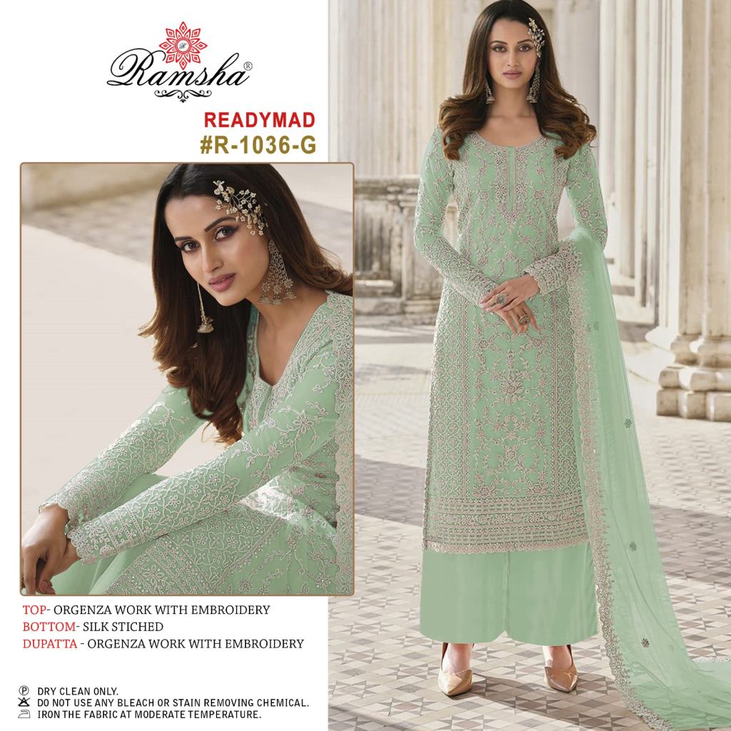 Ramsha R 1036 Readymade Designer Pakistani Suit collection, this catalogue fabric is organza work with embriodery and bottom fabric is silk stitched and the dupatta fabric is organza work with embroidery have been made from high-quality fabrics and come in different designs also.