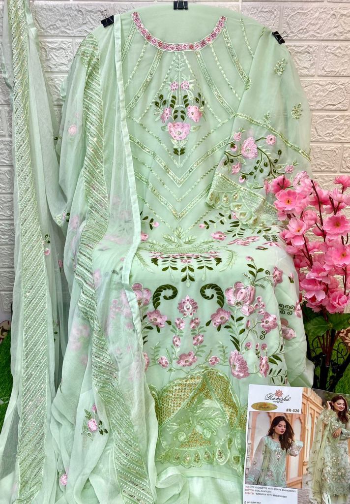 Ramsha R 520 Embroidery Pakistani Salwar Kameez Collection, this catlog fabric is Fox Georgette with fancy embriodry work and the Bottom fabric is dull Santoon with Dupatta fabric is Nazmin with embriodery work (Pakistani Copy)