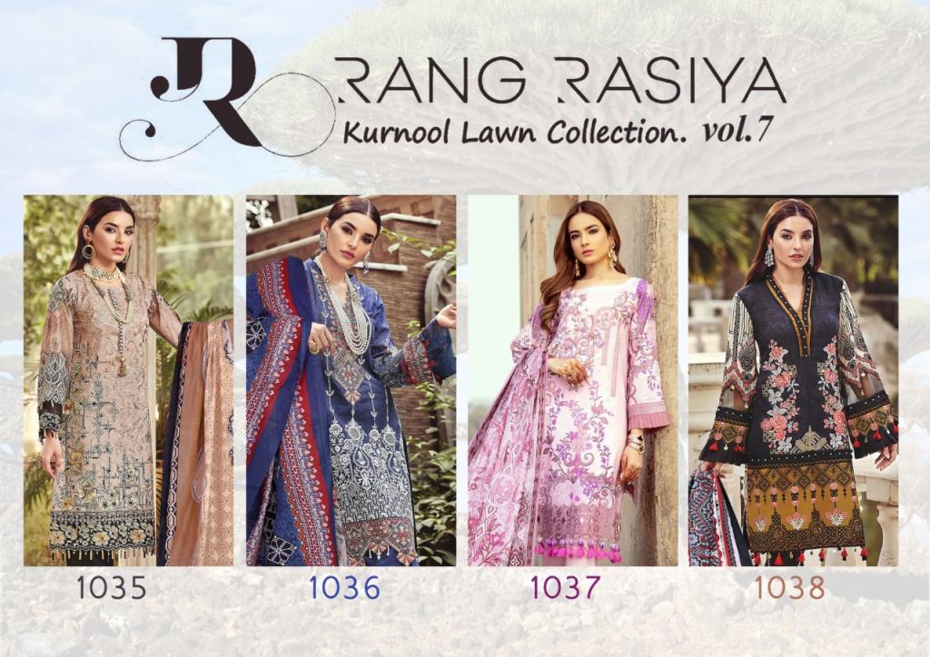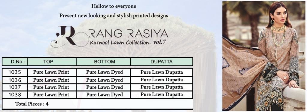 Rang Rasiya Kurnool Lawn Collection vol 7 Pakistani Salwar Suits, this catalog top is pure lawn fancy print and bottom is pure lawn dyed and dupatta is pure lawn and design are some little printed with pattern will be various.
