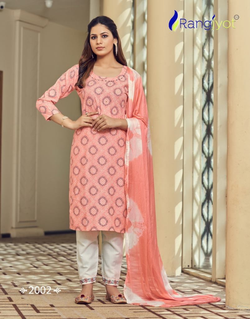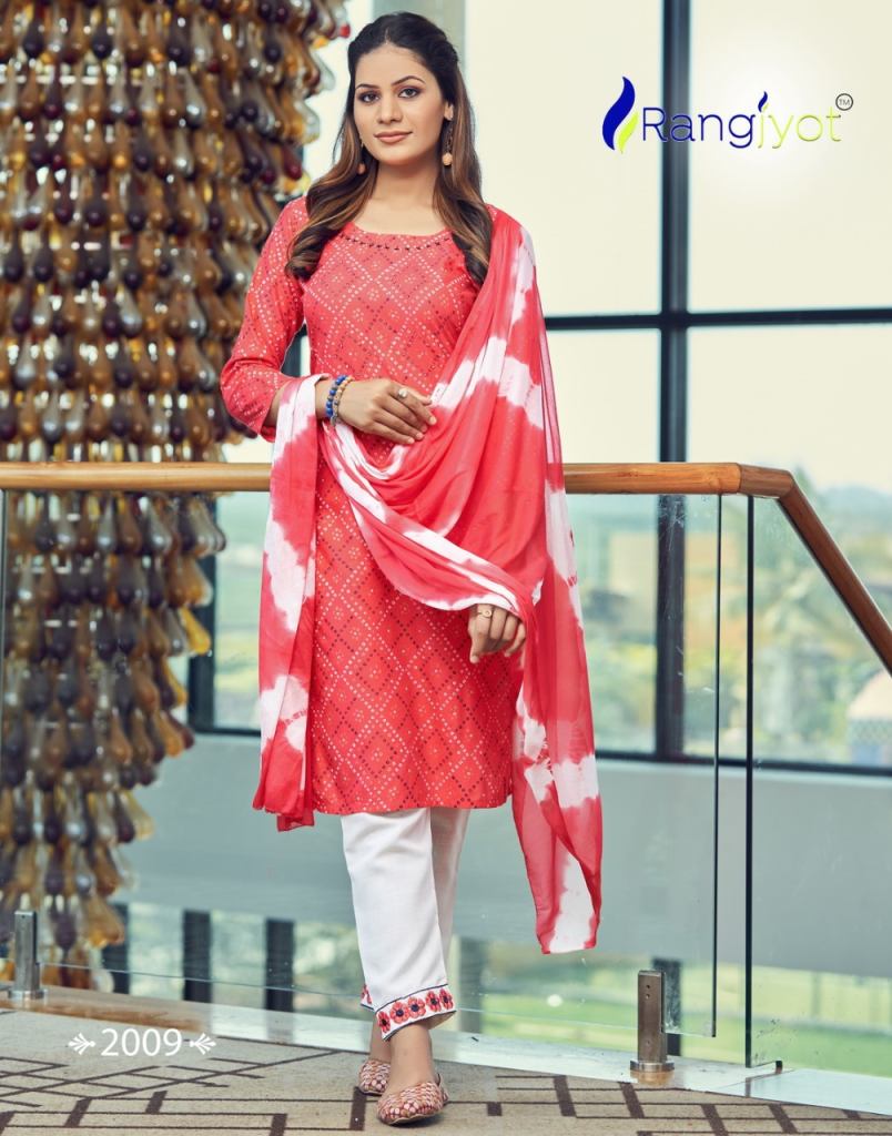 Rangjyoti Saheli 2001 Stylish Wear Ready Made Kurtis Collection, this catalogue fabric is 4 Kg Rayon Print and Bottom are Slub Cotton Pent with Dupatta fabric is Viscose and bandhani print Dupatta.