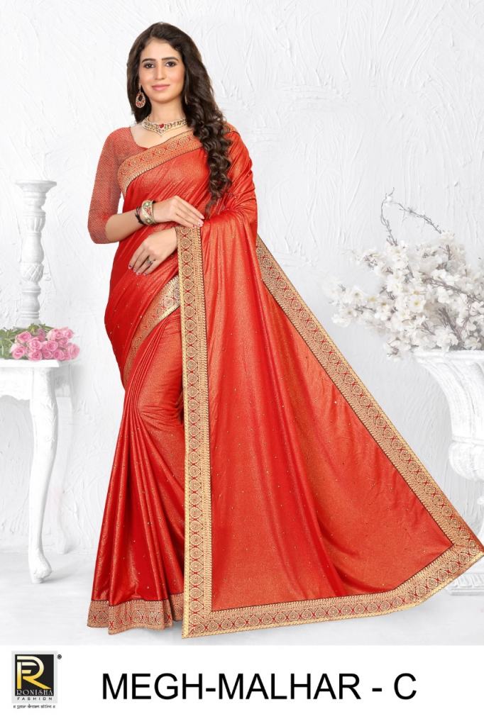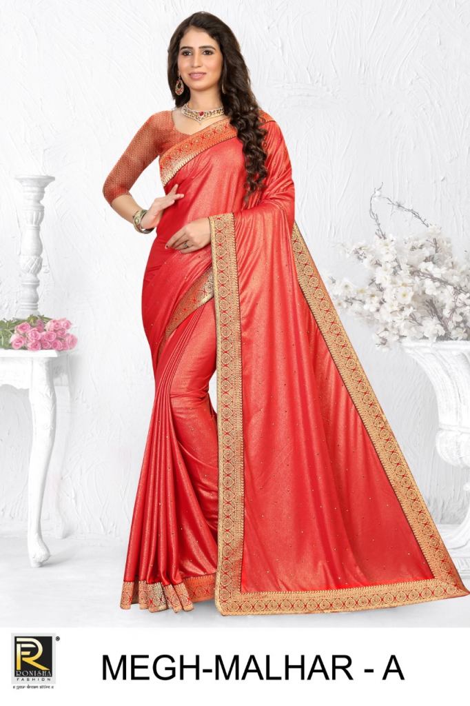 Ranjna Megh Malhar wholesale Sarees online shopping, this catalog fabric is lycra and this catalog different colors with catalog are designer border and this Blouse are Diamond work with the fancy collection and this catalog is sarees are party wear sarees collection.