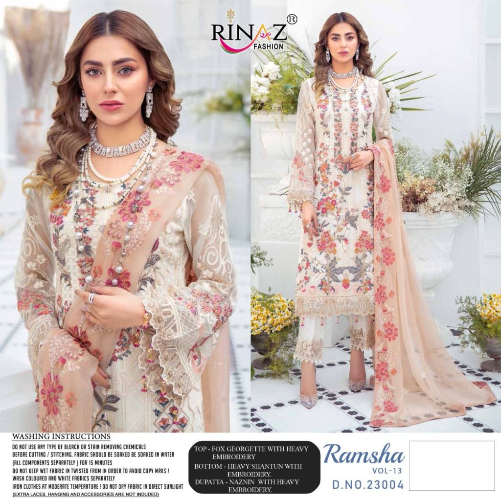 Rinaz Ramsha Vol 13 Georgette Wear Pakistani Salwar Kameez Catalog. This catalog fabric is Top: fox georgette with heavy embroidery | Bottom: heavy shantun with embroidery | Dupatta: nazmin with heavy embroidery (Pakistani copy).