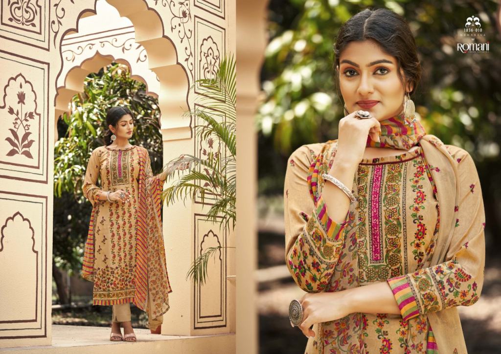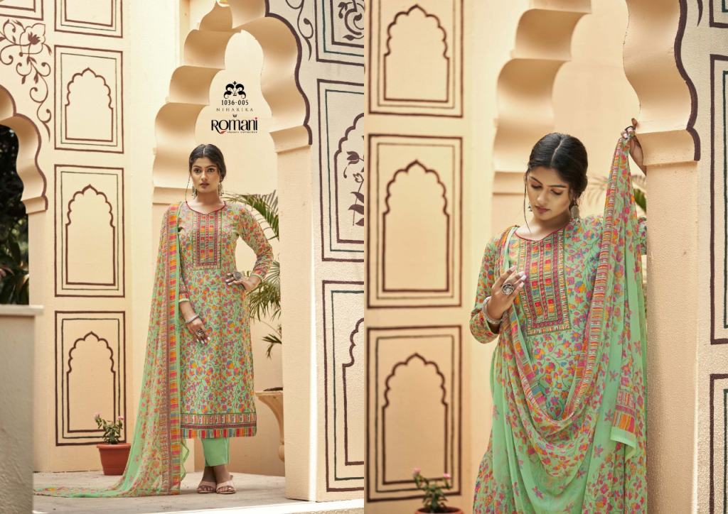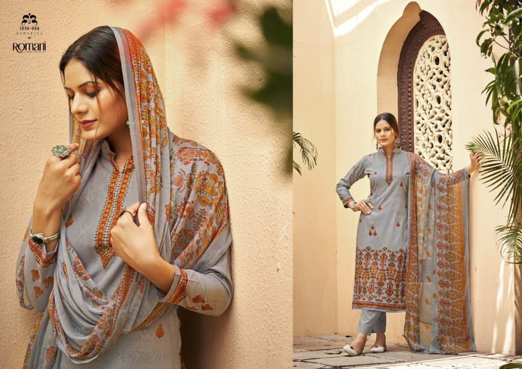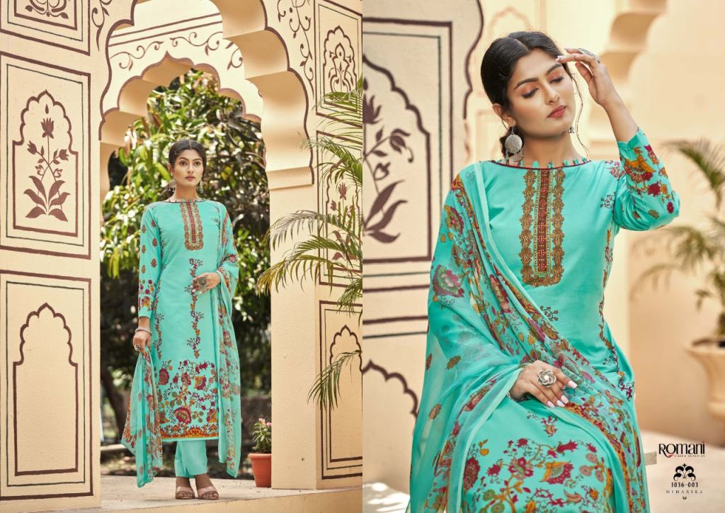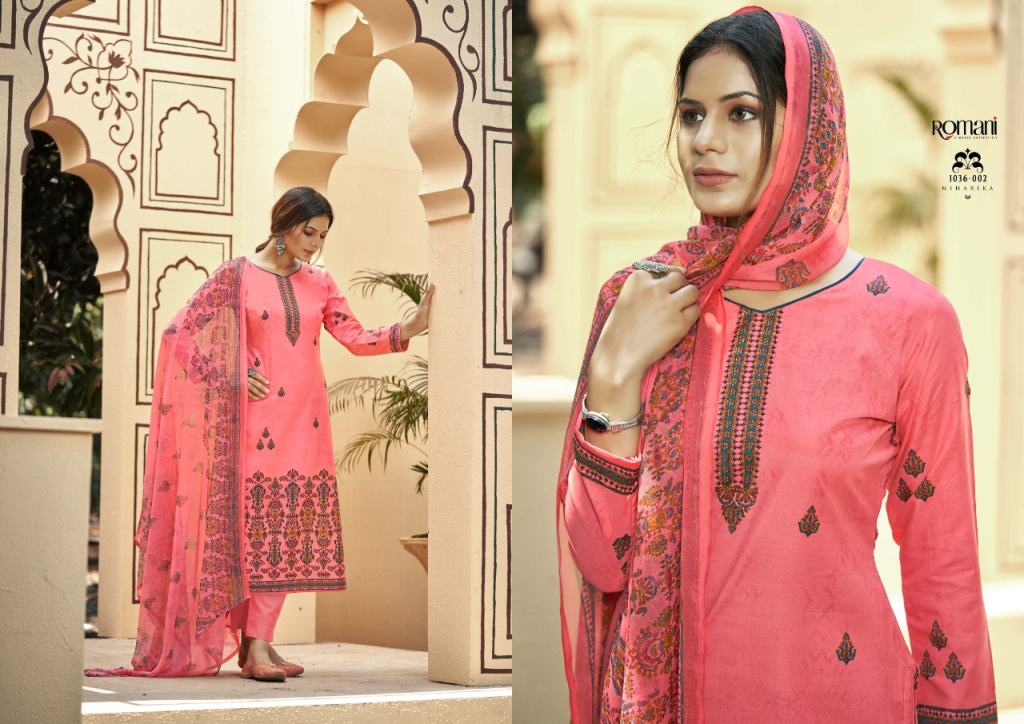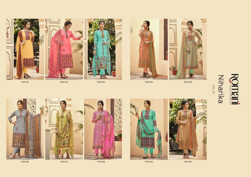 Romani Niharika Vol 2 Catalog Regular Wear Soft Cotton Unstitched Dress Materials. This catalog Top fabric is Premium Soft Cotton Digital Style Print with Swarovsky Work, (2.50 mtrs) Bottom Soft Cotton Salwar and Dupatta Pure Nazneen Chiffon Printed.