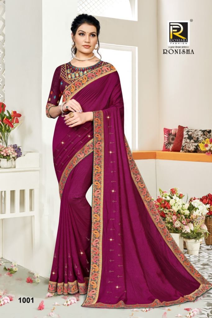 Ronisha Iconic Regular Wear Vichitra Silk Saree Wholesale. In this catalog saree fabric is vichitra silk with beautiful border and embroidery blouse.