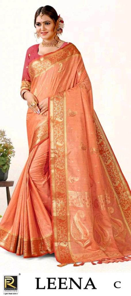 Ronisha Leena Designer Banarasi Silk Saree Collection, this catalogue fabric is silk and different soft Banarasi silk with beautiful weaving work all over the saree, exclusive border latkan in pallu.