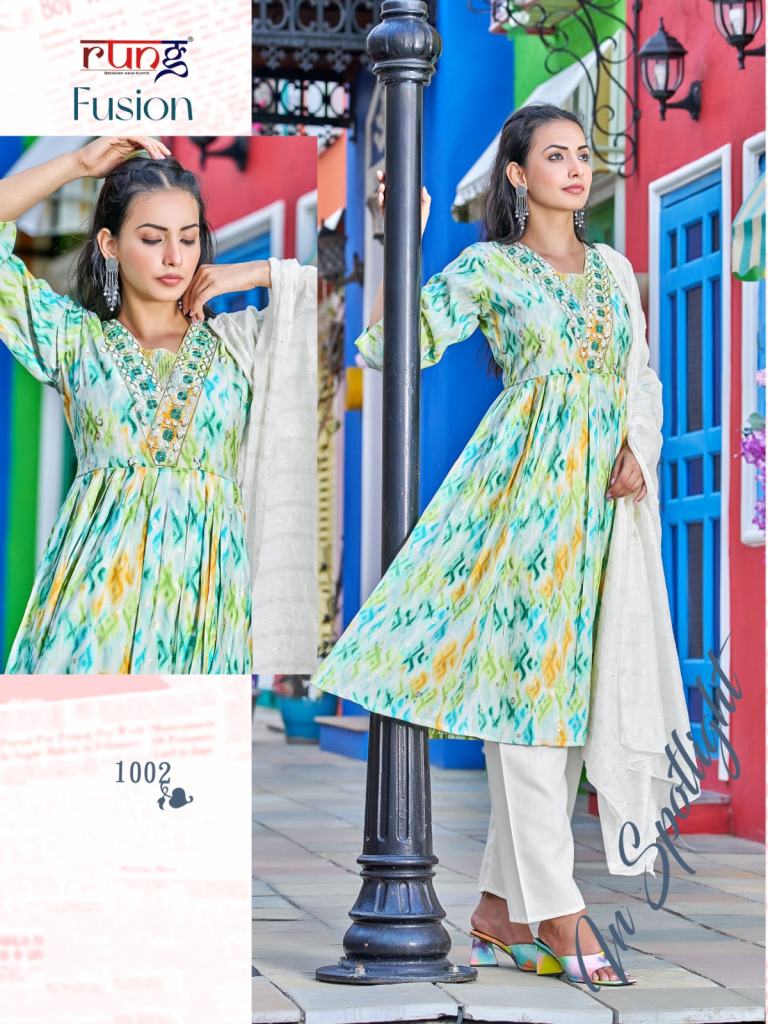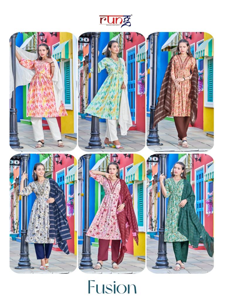 Buy Rung Fusion Designer Wear Modal Silk Kurti Bottom With Dupatta. This catalog top fabric is modal silk with neck embroidery work, bottom fabric is premium rayon and dupatta silk jacquard.