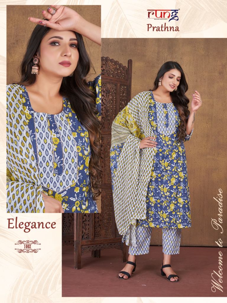 Rung Prathna Festive Wear Top Bottom And Dupatta. In this set top fabric is heavy cotton printed with some exclusive work, bottom fabric is soft cotton and dupatta is mal mal printed.