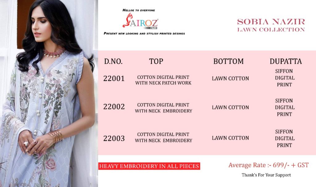 Sairoz Sobia Nazir Designer Cotton Embroidery Pakistani Salwar suits catalog. this catalog fabric is Pure Heavy Quality Material Heavy Cotton With Beautiful Digital Print With Heavy Embroidered Patches | Bottom: Pure Heavy Quality Material Heavy Lawn Cotton | Dupatta: Chiffon Digital Print.