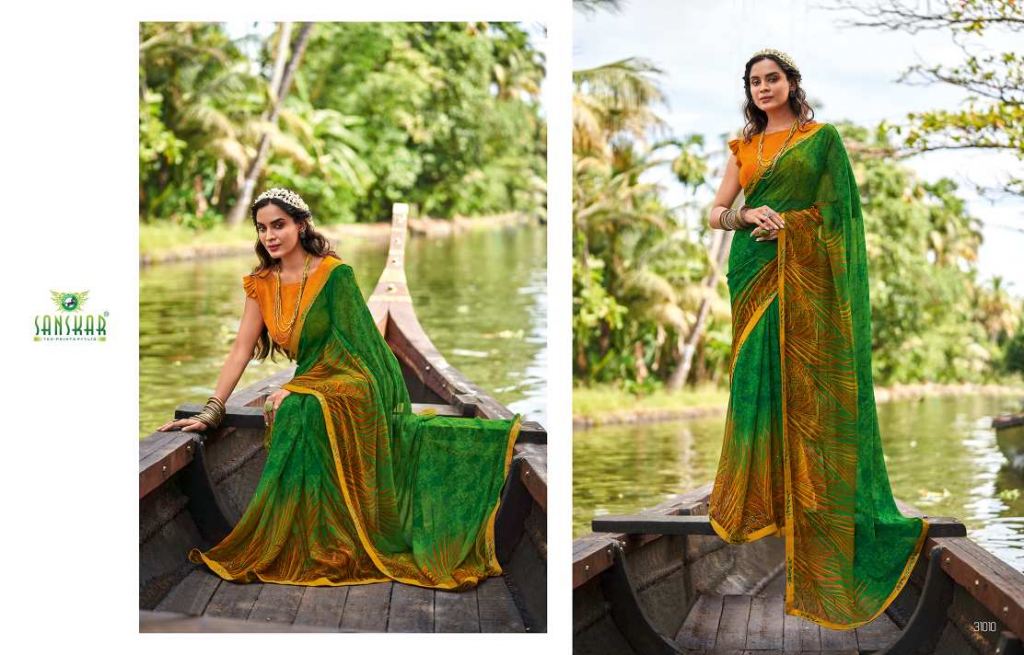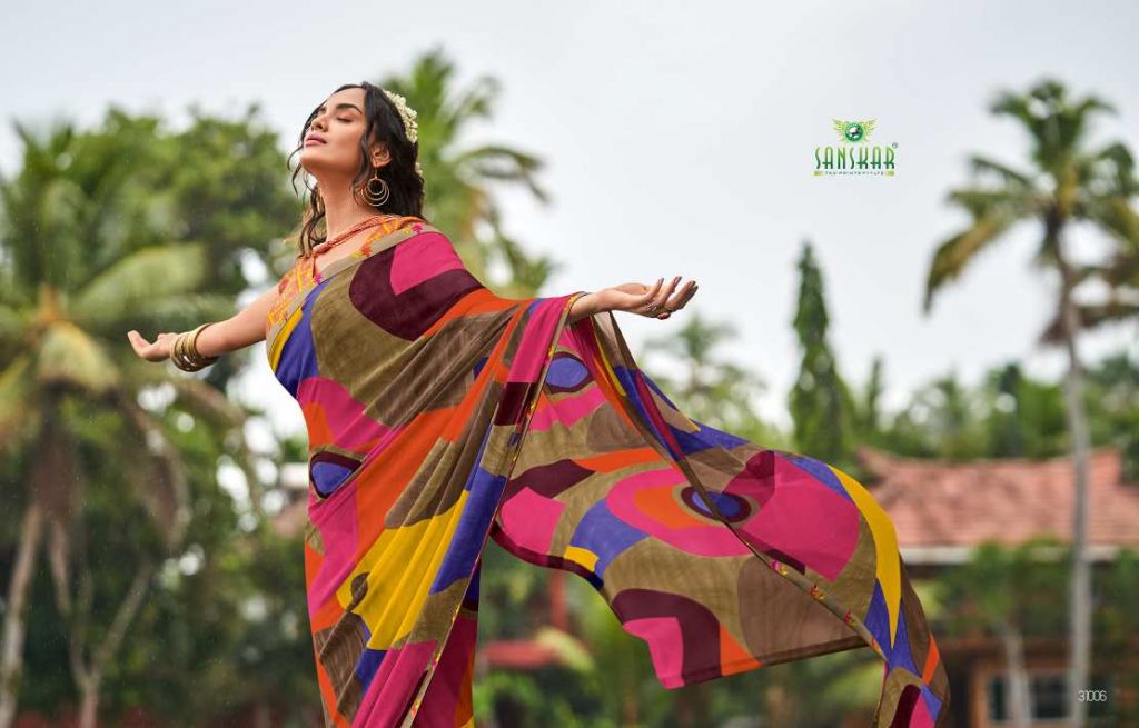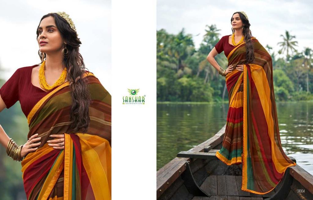 Sanskar Saachi Printed Wear Georgette Saree Catalog, this catalog fabric is Georgette, and this catalog is exclusive with modern types. Blouses are also different in color and match with sarees designs.