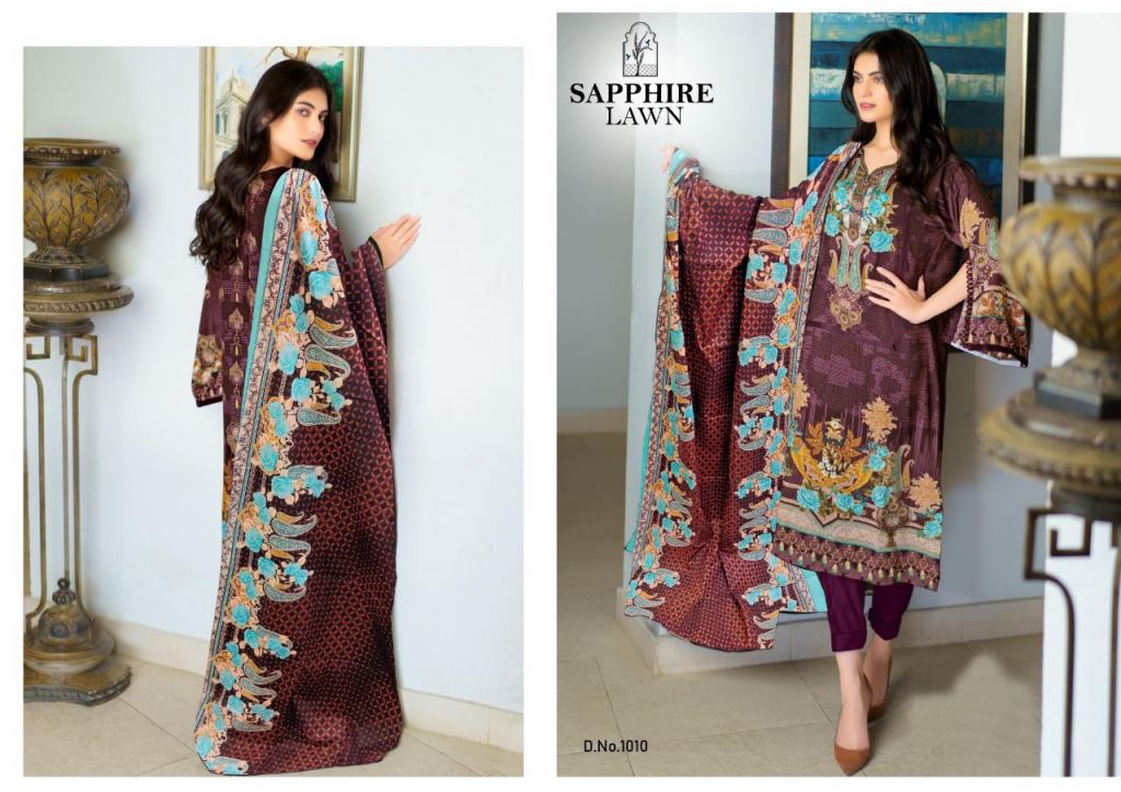 Sapphire Lawn Karachi Dress Materials, this catalog fabric is top Pure Lawn(cut:2.35 mtr) | Bottom: pure Lawn (cut:2 mtr) | Dupatta: Pure Cotton Mal Mal (cut 2.25 mtr), various designs with color combinations and designs are different.