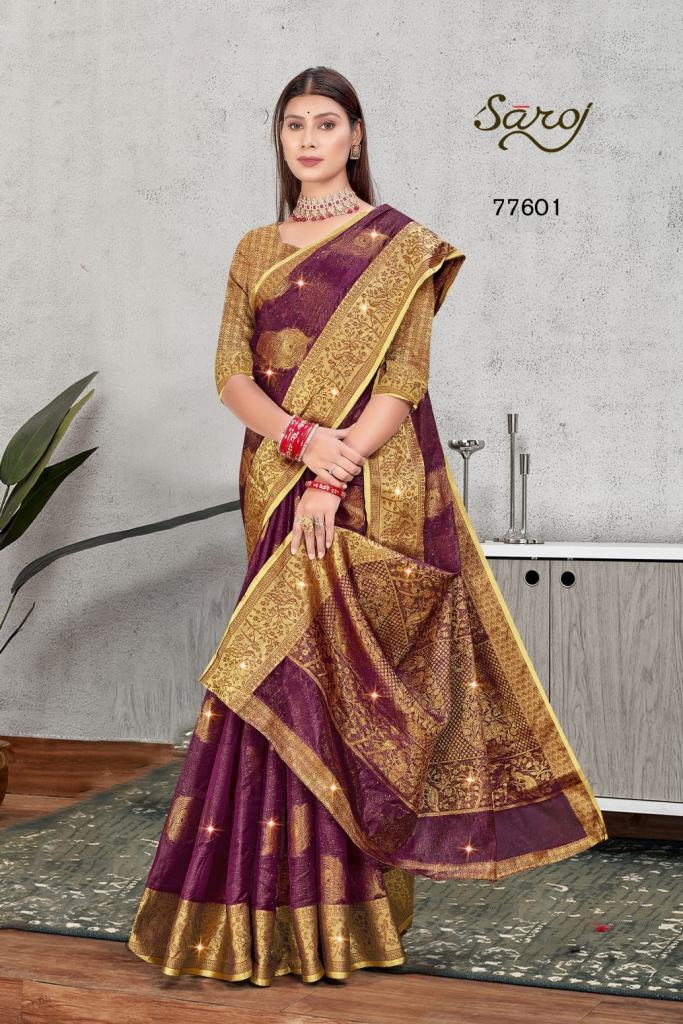 Saroj Ishaani Vol 1 Festive Wear Soft Organza Saree Collection. In this set saree fabric is Soft Organza Fancy Designs with Heavy Swarovski Work & Unstitched blouse pcs.