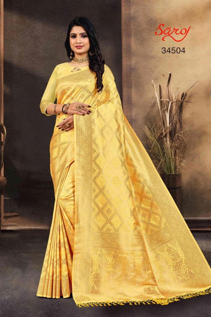 Saroj Kora Silk Vol 2 Heavy Silk Designer Saree Collection. This catalog fabric is Silk Heavy Rich Pallu saree with Unstitched Blouse Piece.